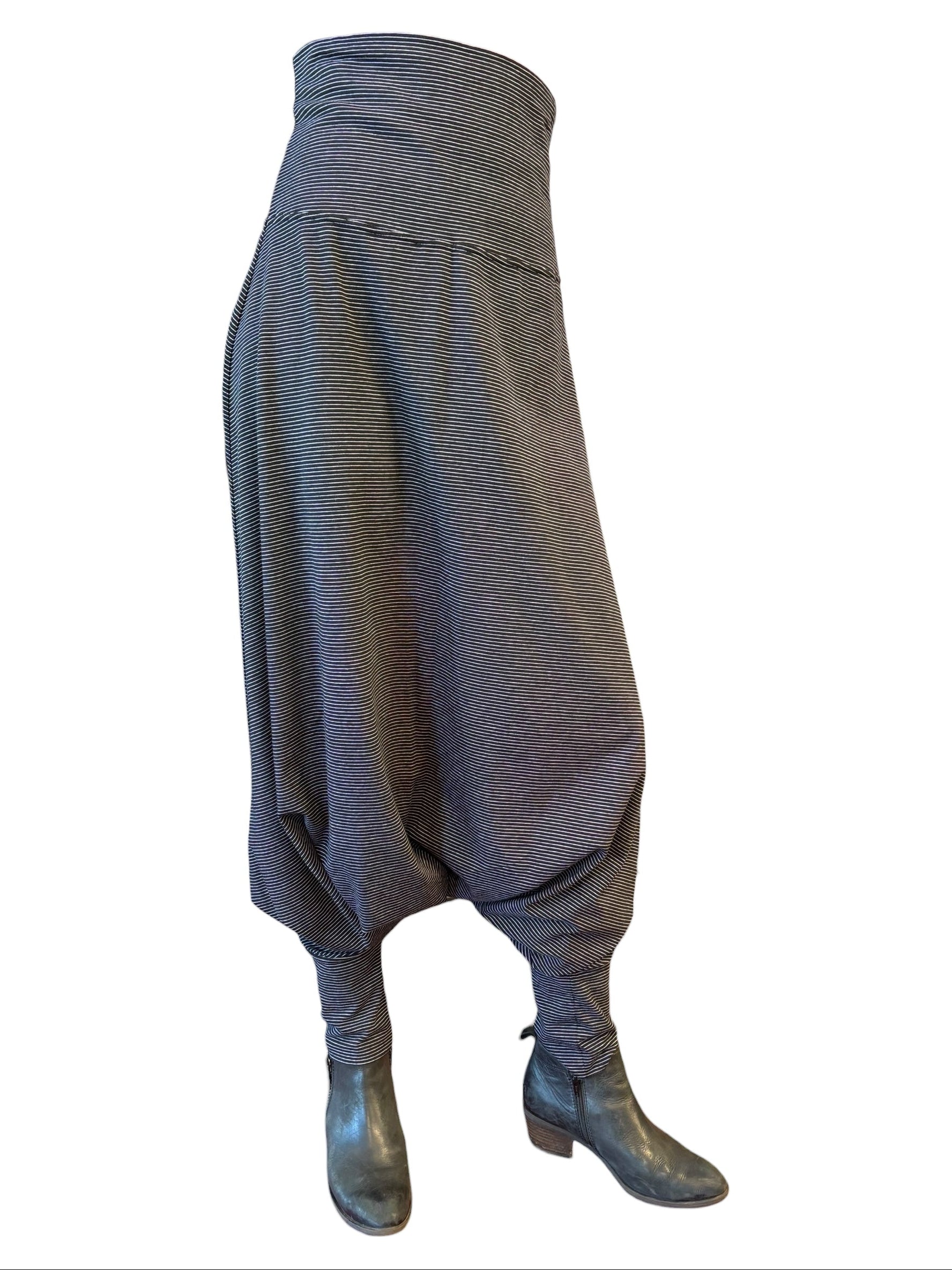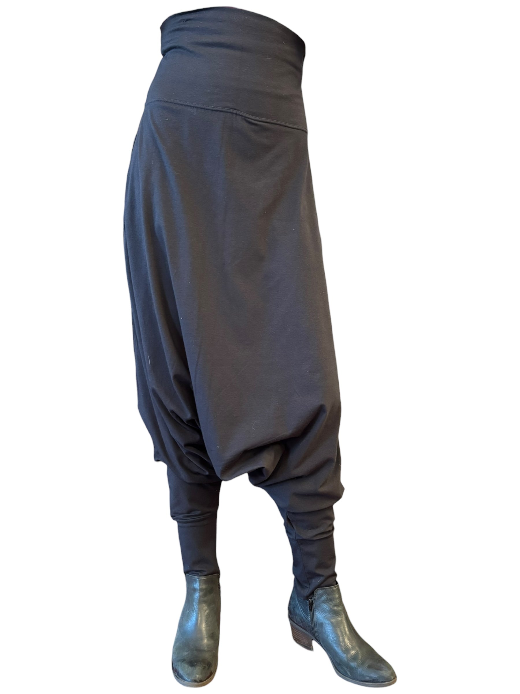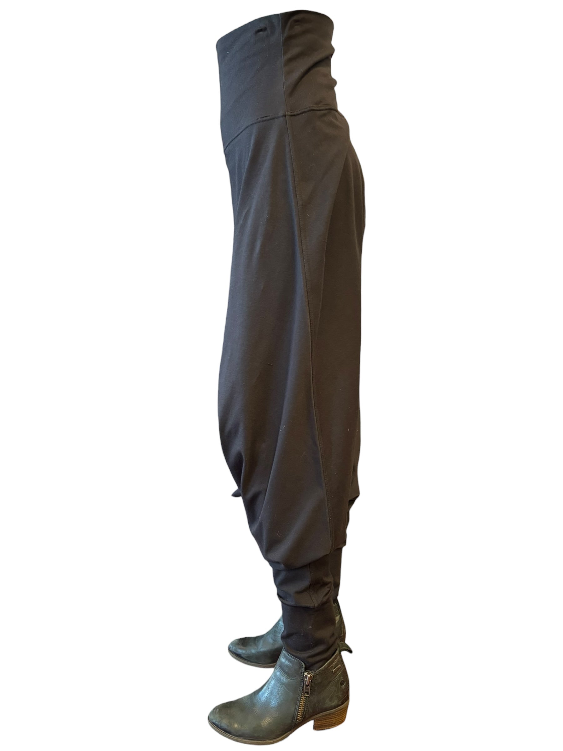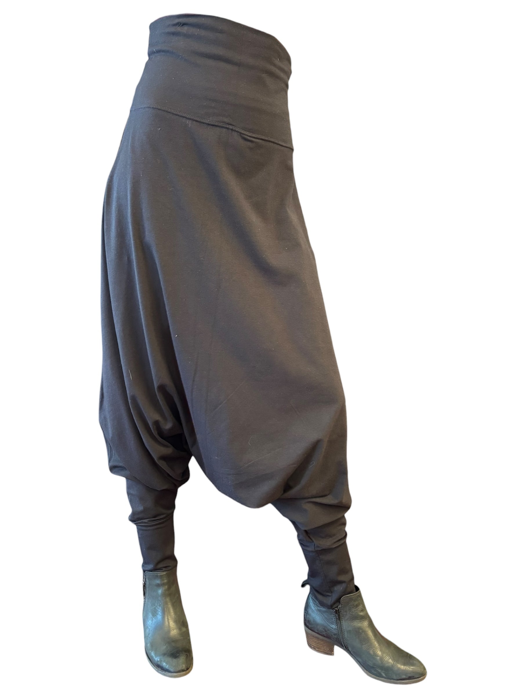 Harem pants with a wide waistband and wide cuffs at the bottom.