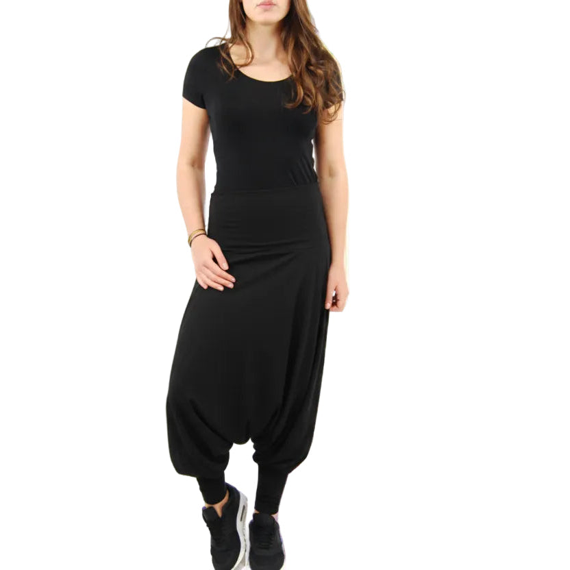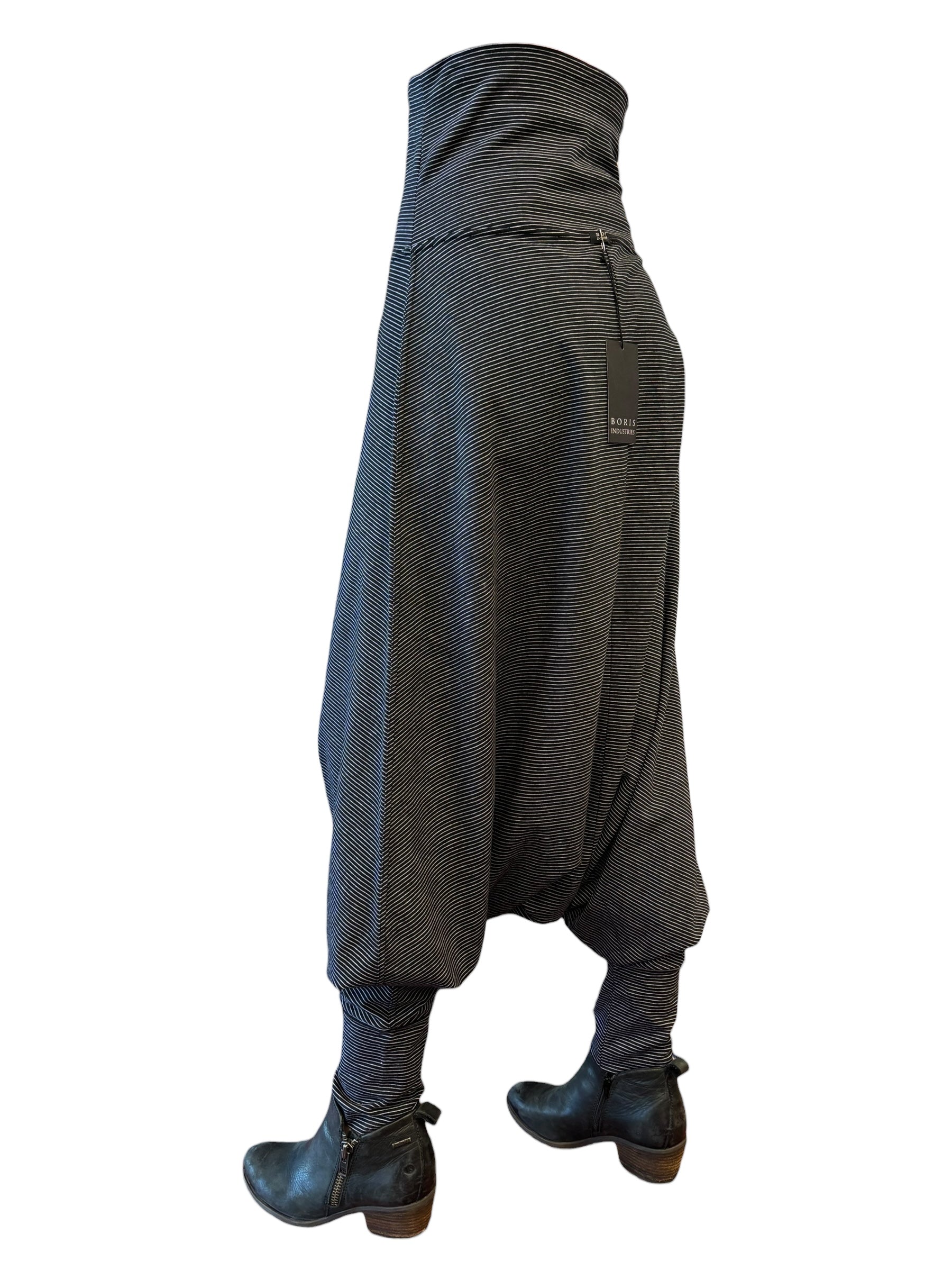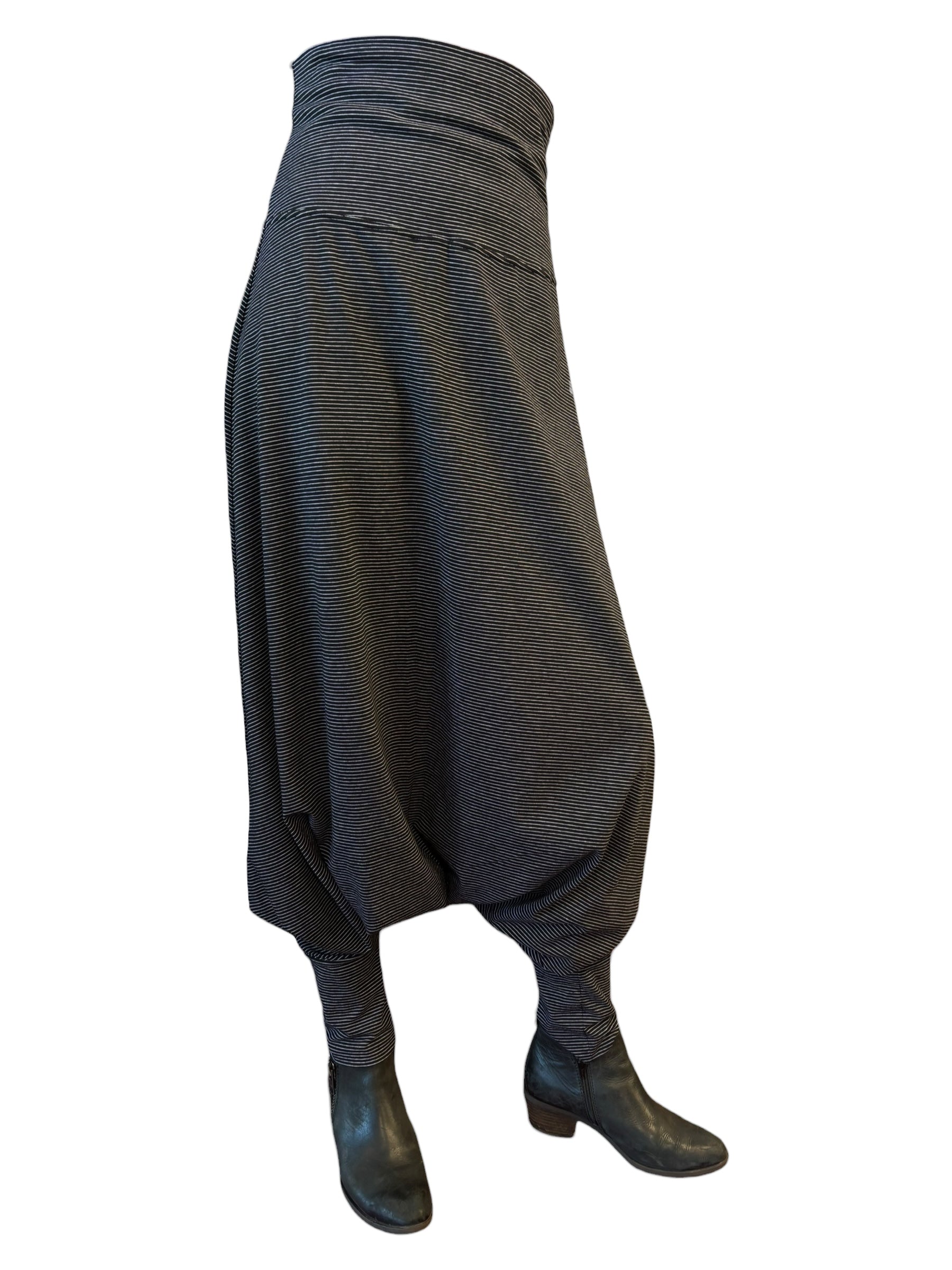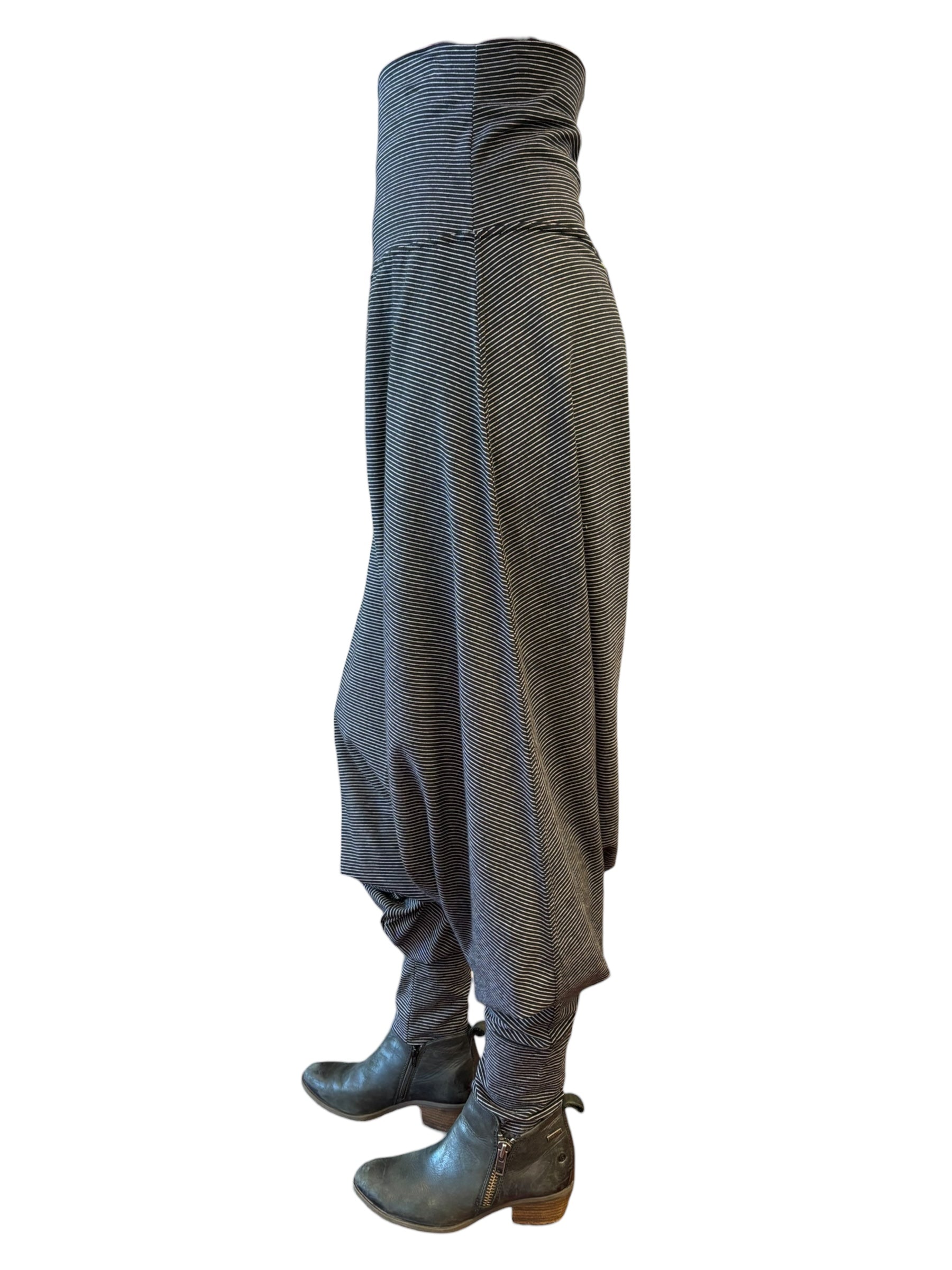 Harem pants with a wide waistband and wide cuffs at the bottom.