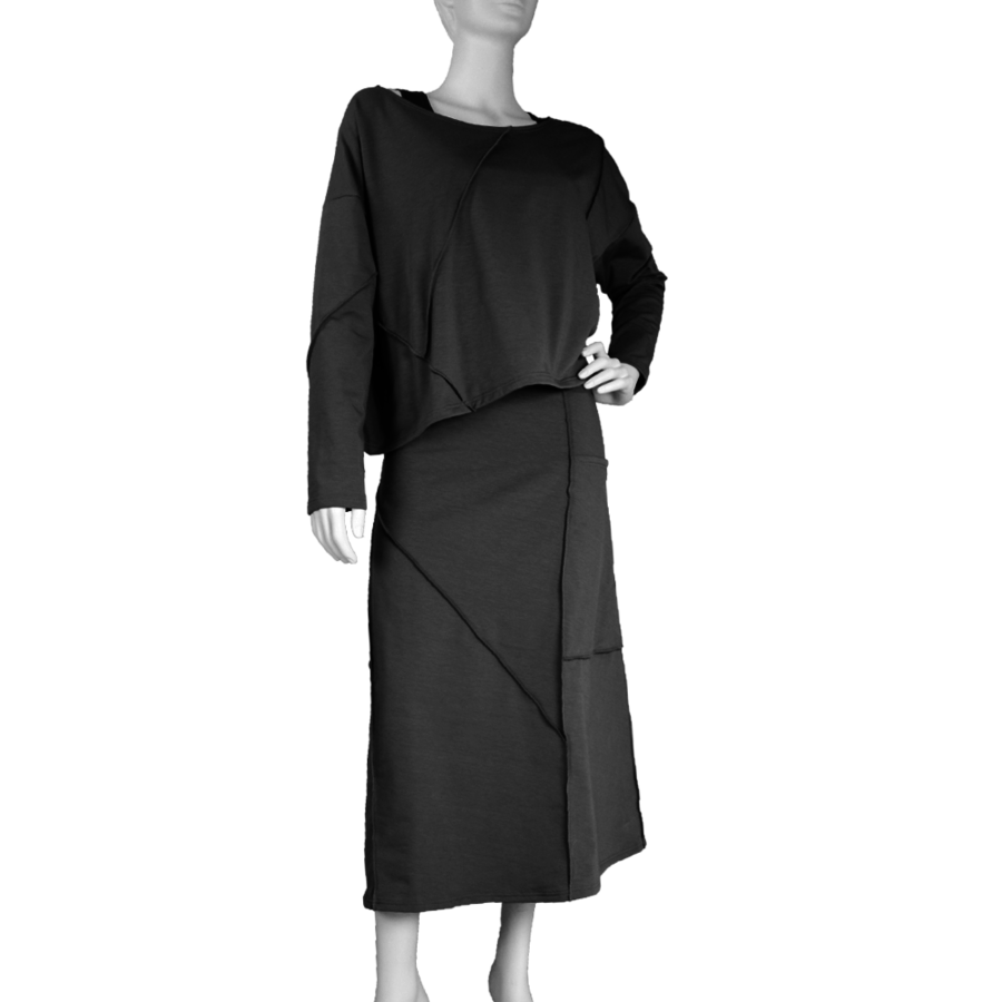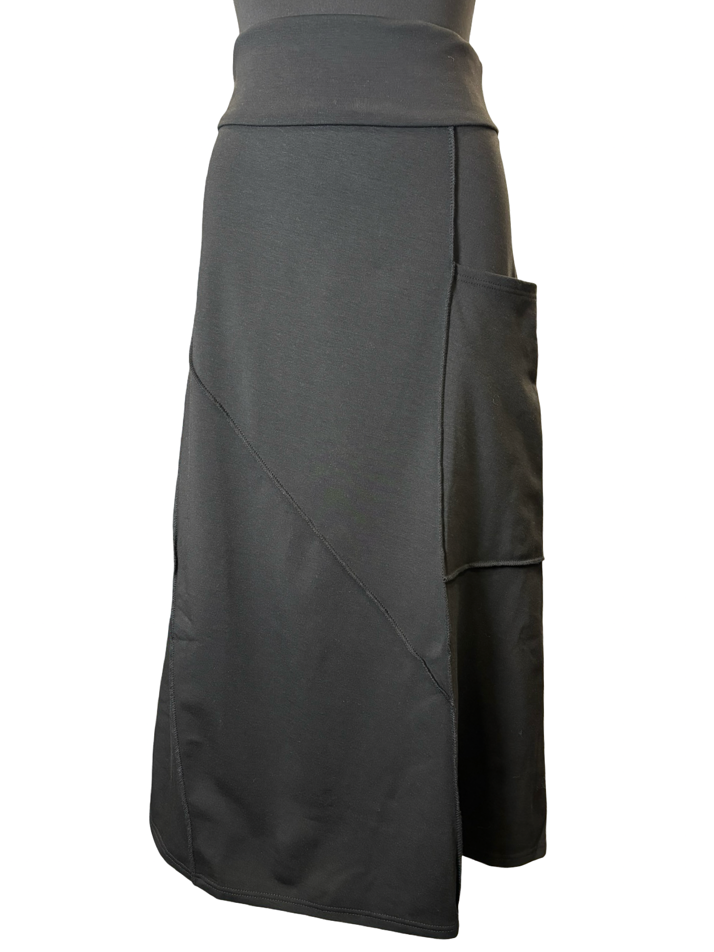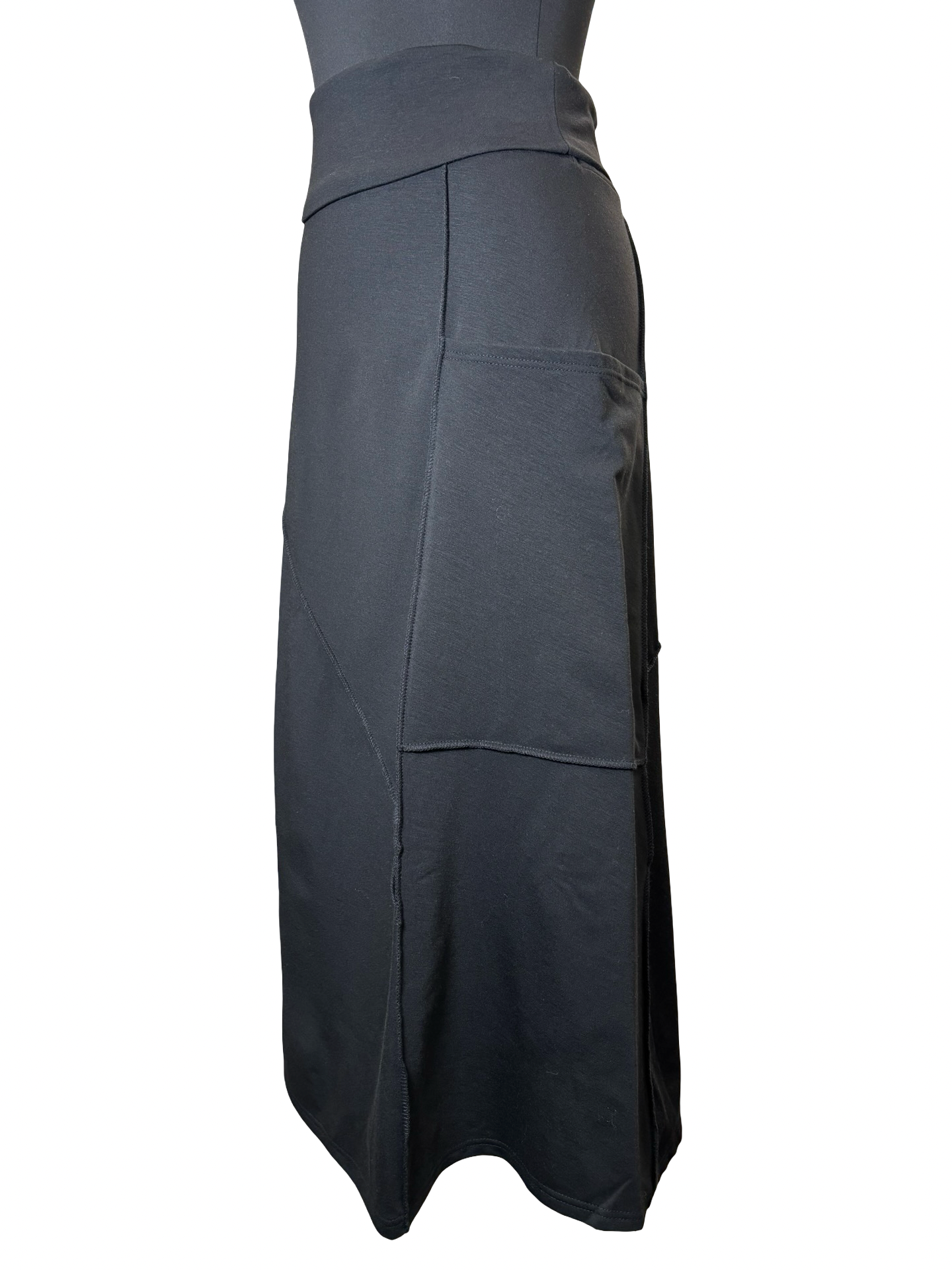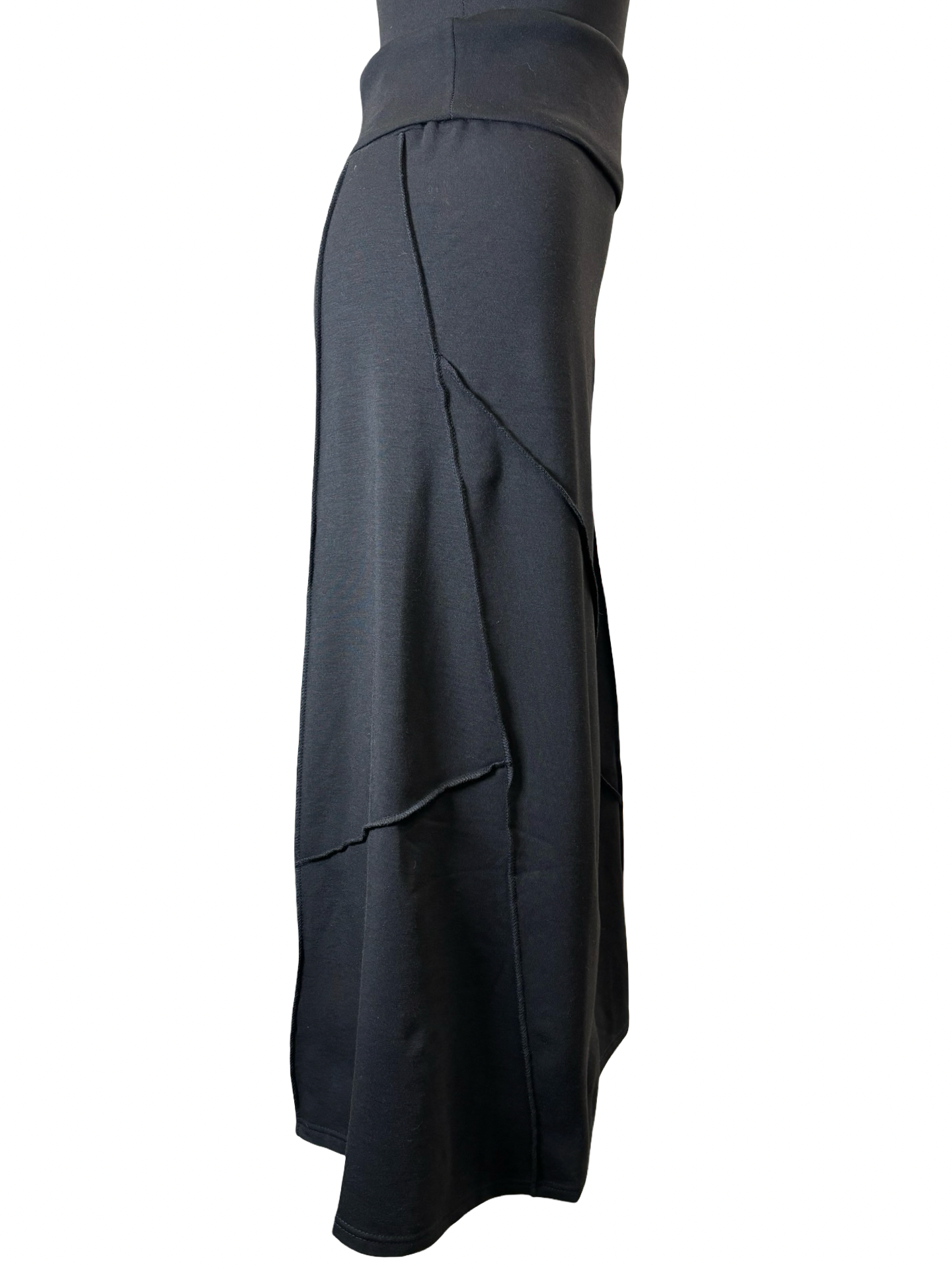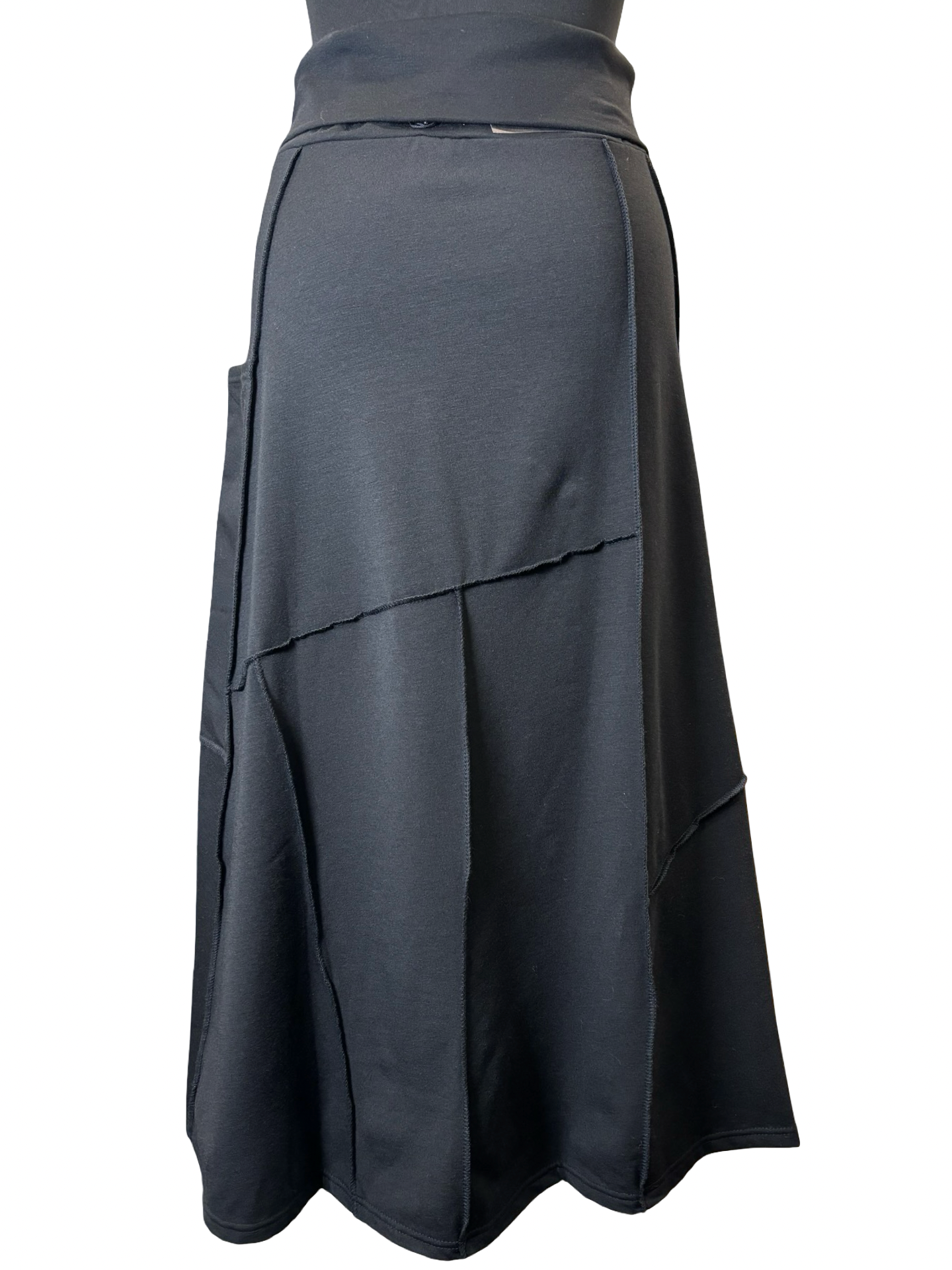 A long skirt with panels and stitching on the outside. This skirt is made of a heavier viscose with a soft lining.
