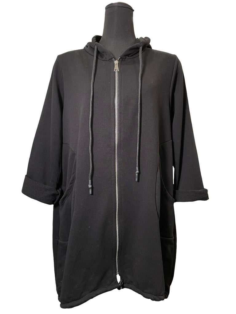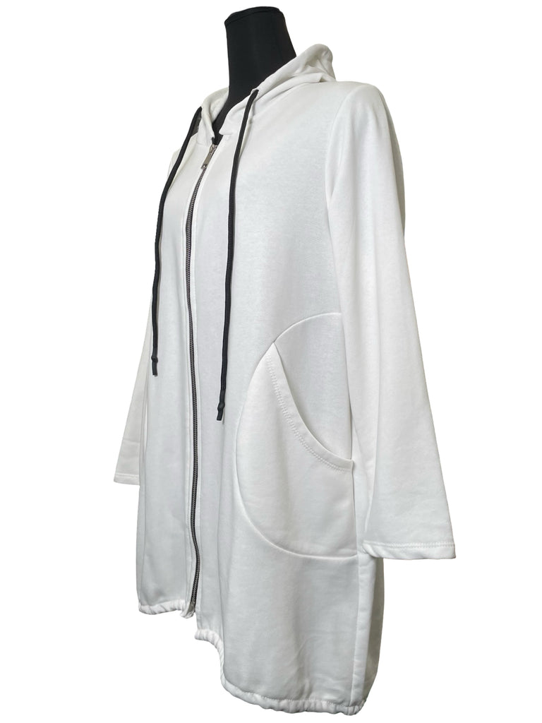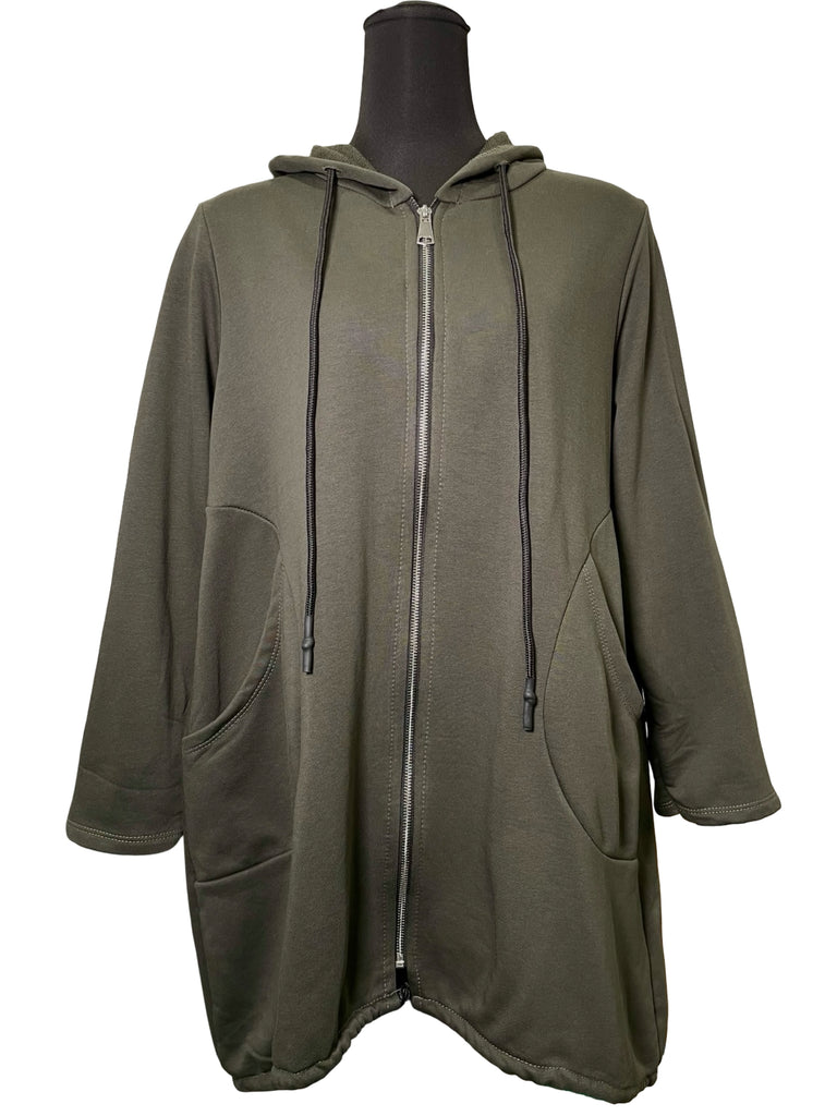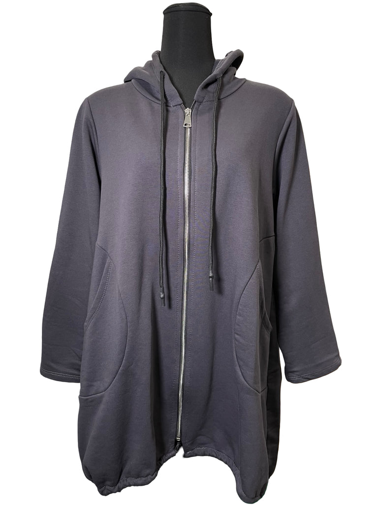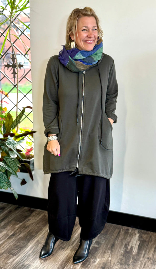 The perfect little sweater! Features a hood with a drawstring, full zipper, toggles on the hips, round seam pockets, and comfortable french terry fabric.