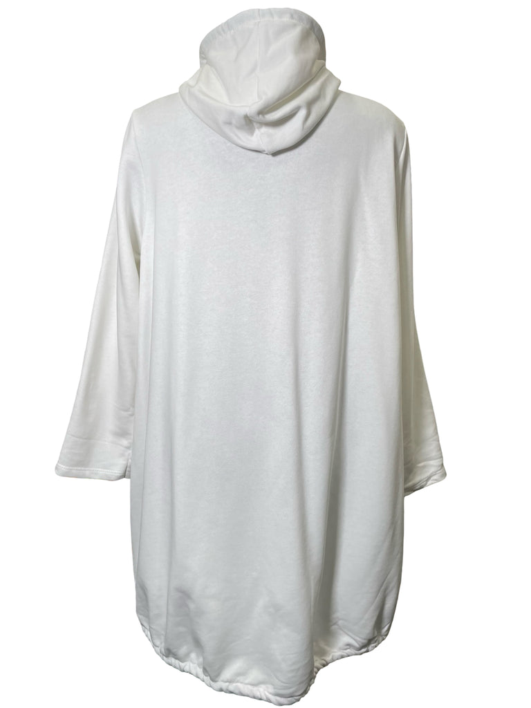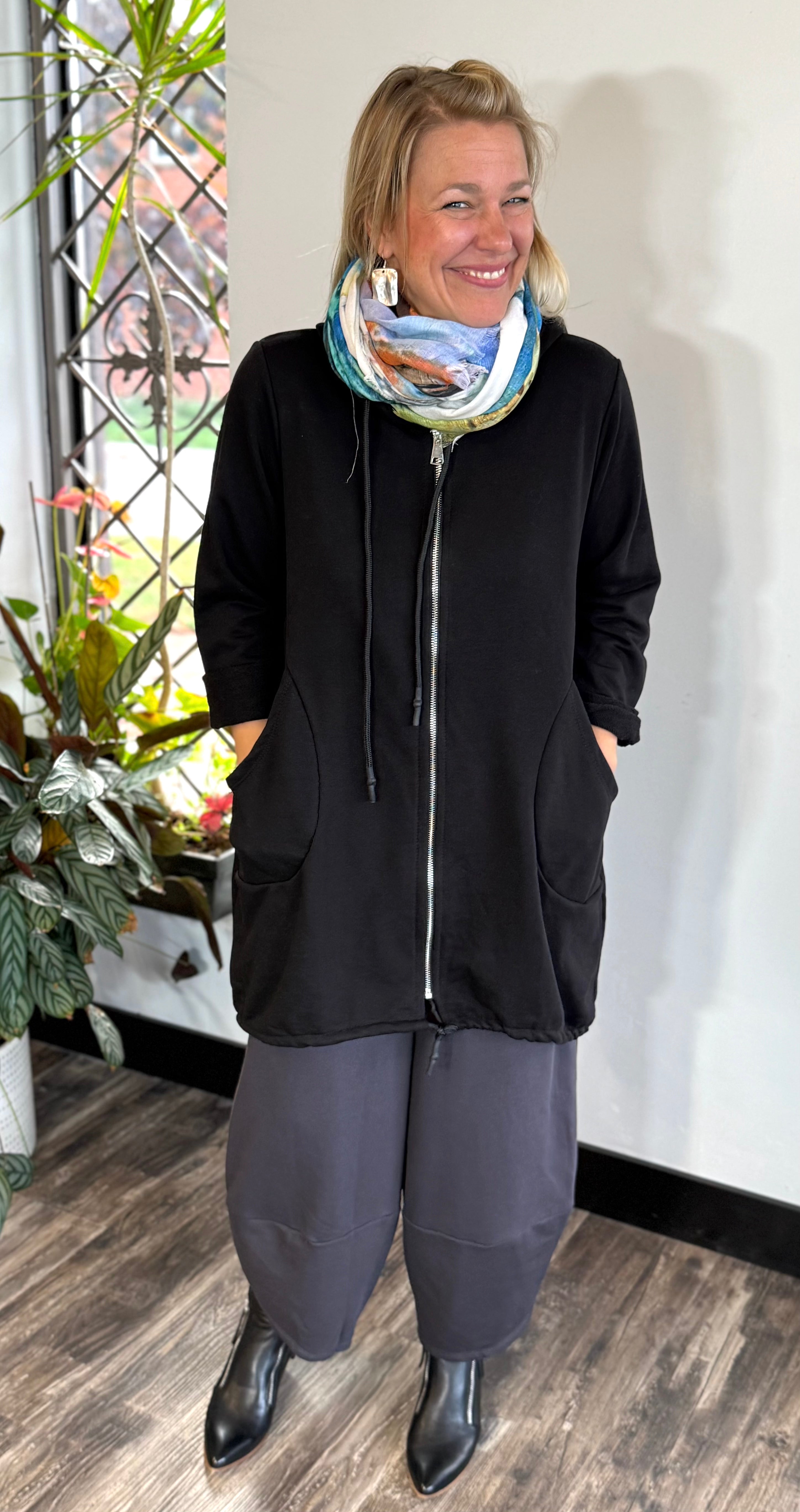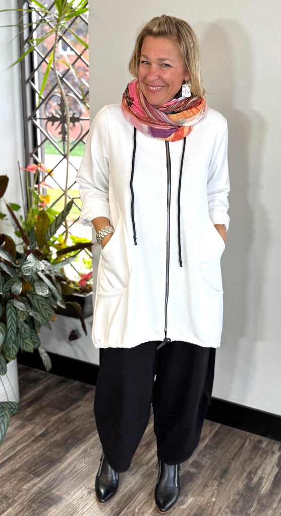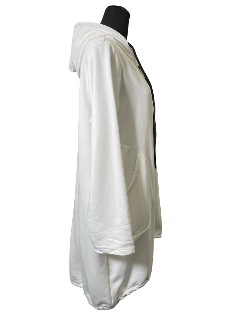 The perfect little sweater! Features a hood with a drawstring, full zipper, toggles on the hips, round seam pockets, and comfortable french terry fabric.