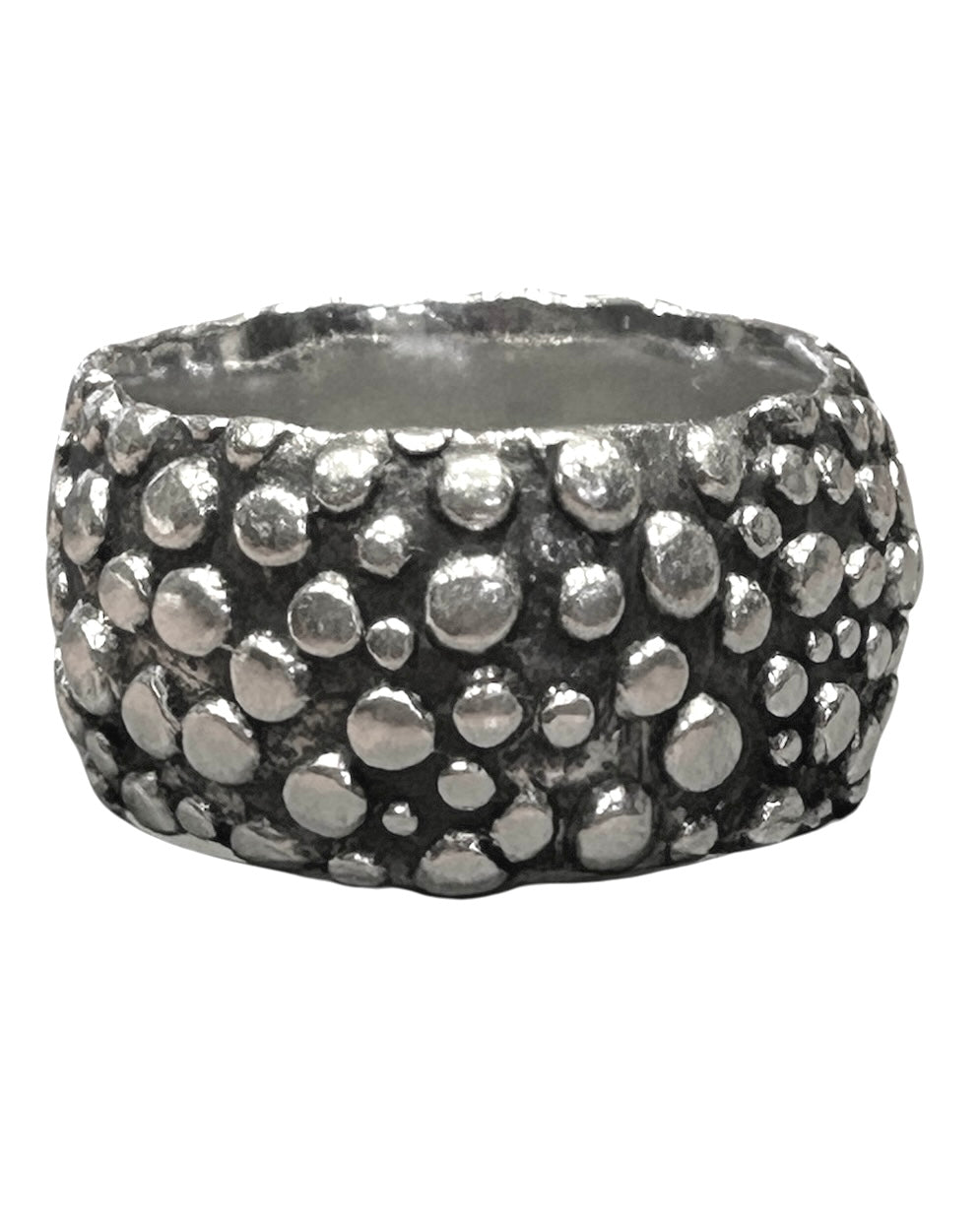 Sterling silver - oxidized deep black, then the high points polished back to bright silver.