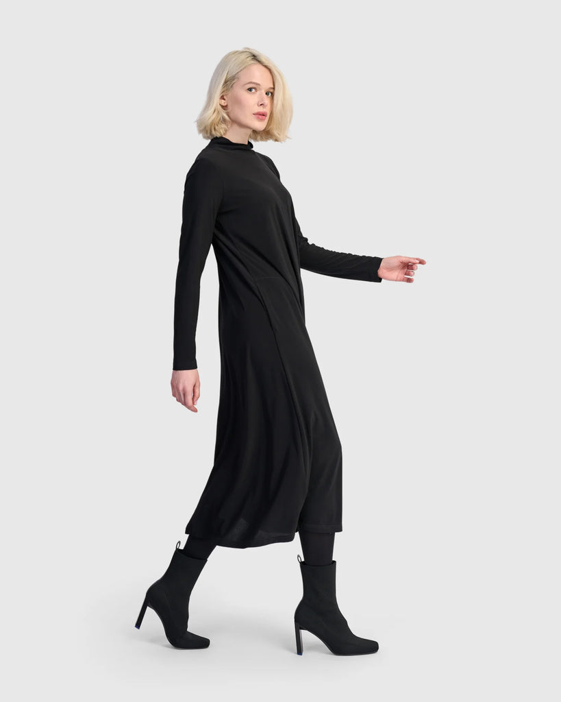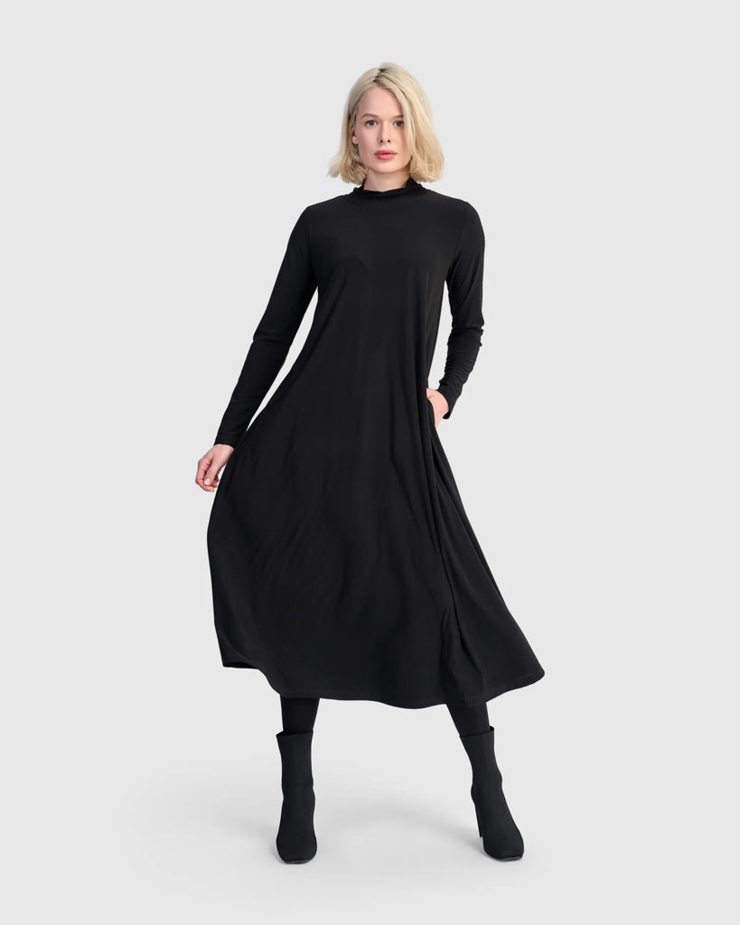 The Essential Slinky A-line Dress in Black is a foundational piece crafted in fluid matte jersey for graceful movement. It skims the shoulders and bust before releasing into a flowing A-line shape that flatters every silhouette. Designed with a sleek mock neck, long slim sleeves, and discreet side pockets, this versatile maxi dress is effortless to layer or wear solo, balancing comfort and sophistication.