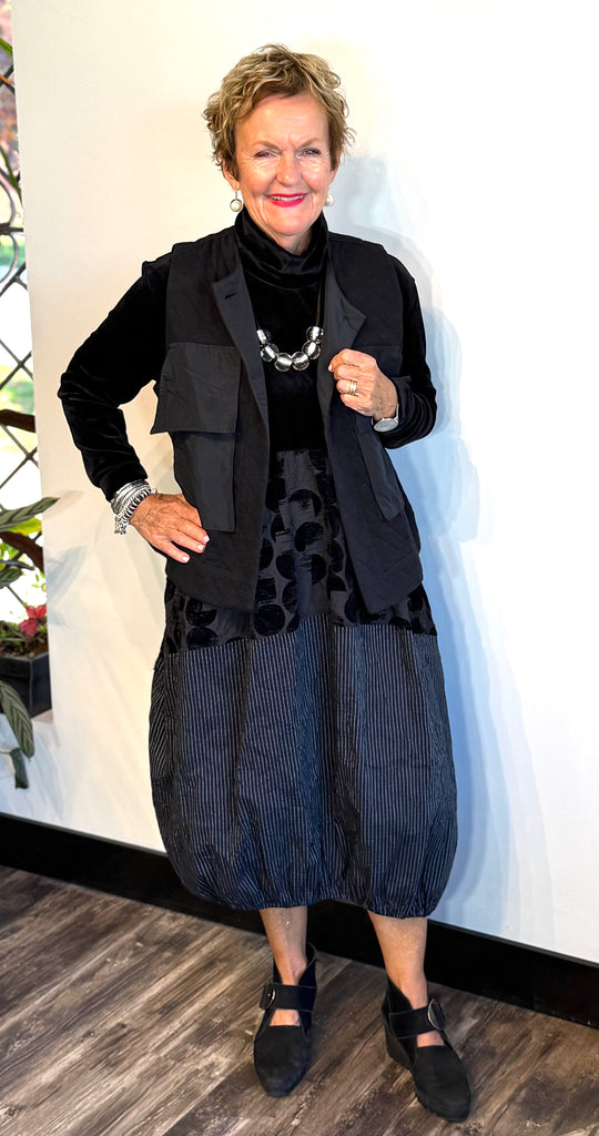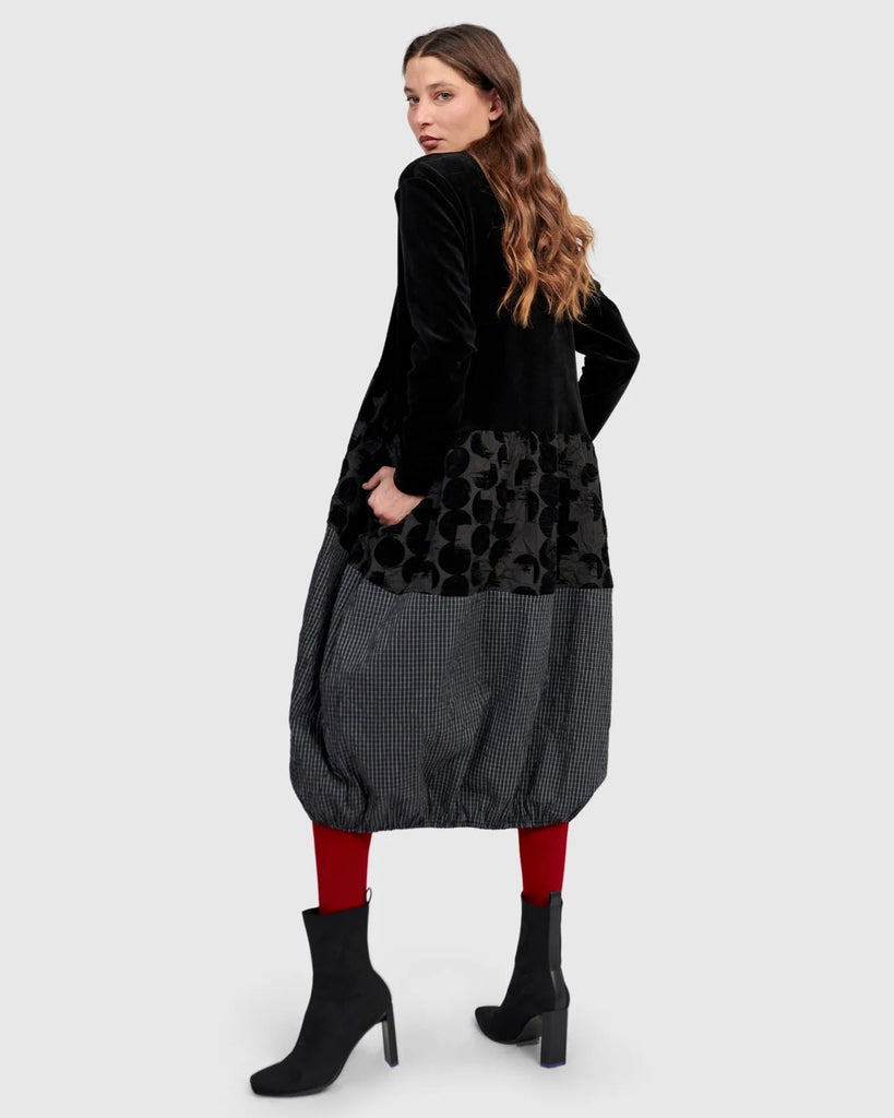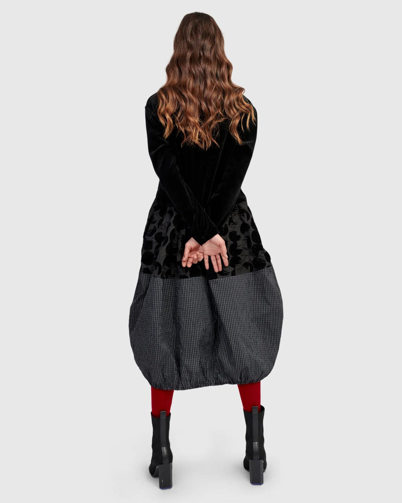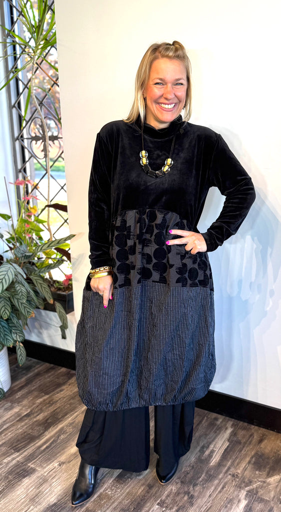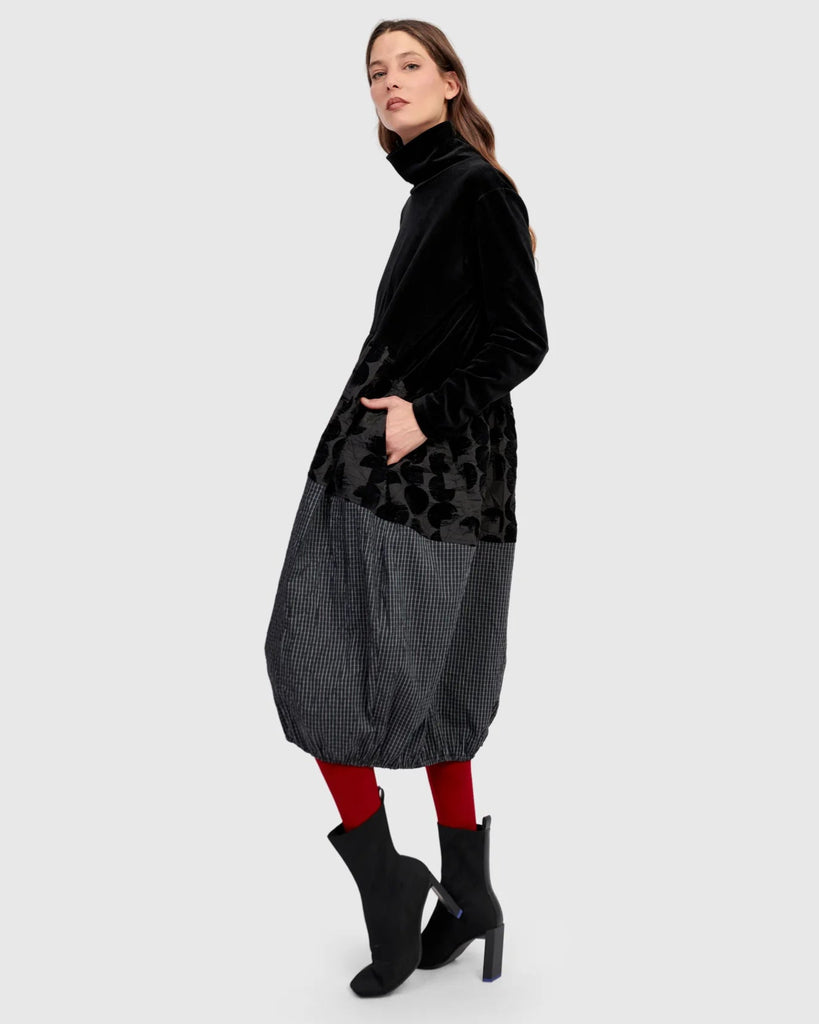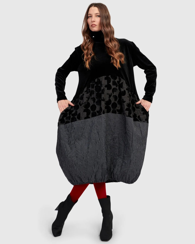 A softly sculpted cocoon dress that fuses stretch velvet and crinkled woven textures. The slim fit bodice transitions into a fuller skirt, creating easy movement while maintaining a refined shape. Patchwork piecing adds dimension and contrast, while a mock neck and long sleeves complete the transitional silhouette with understated elegance.