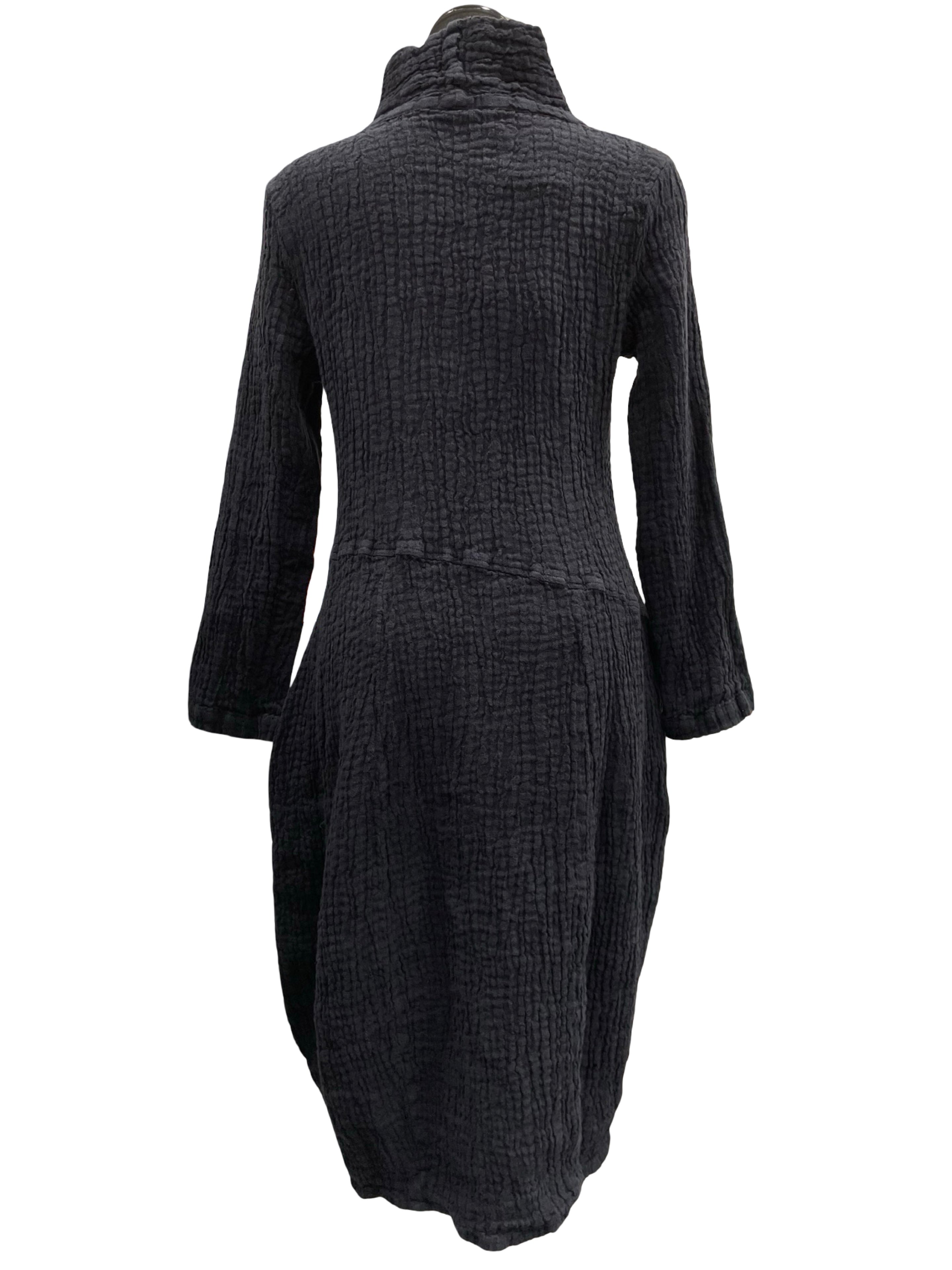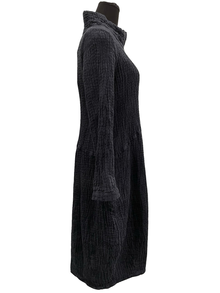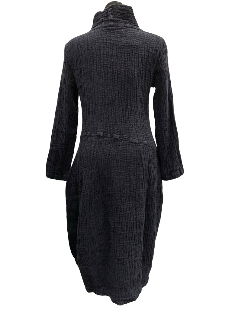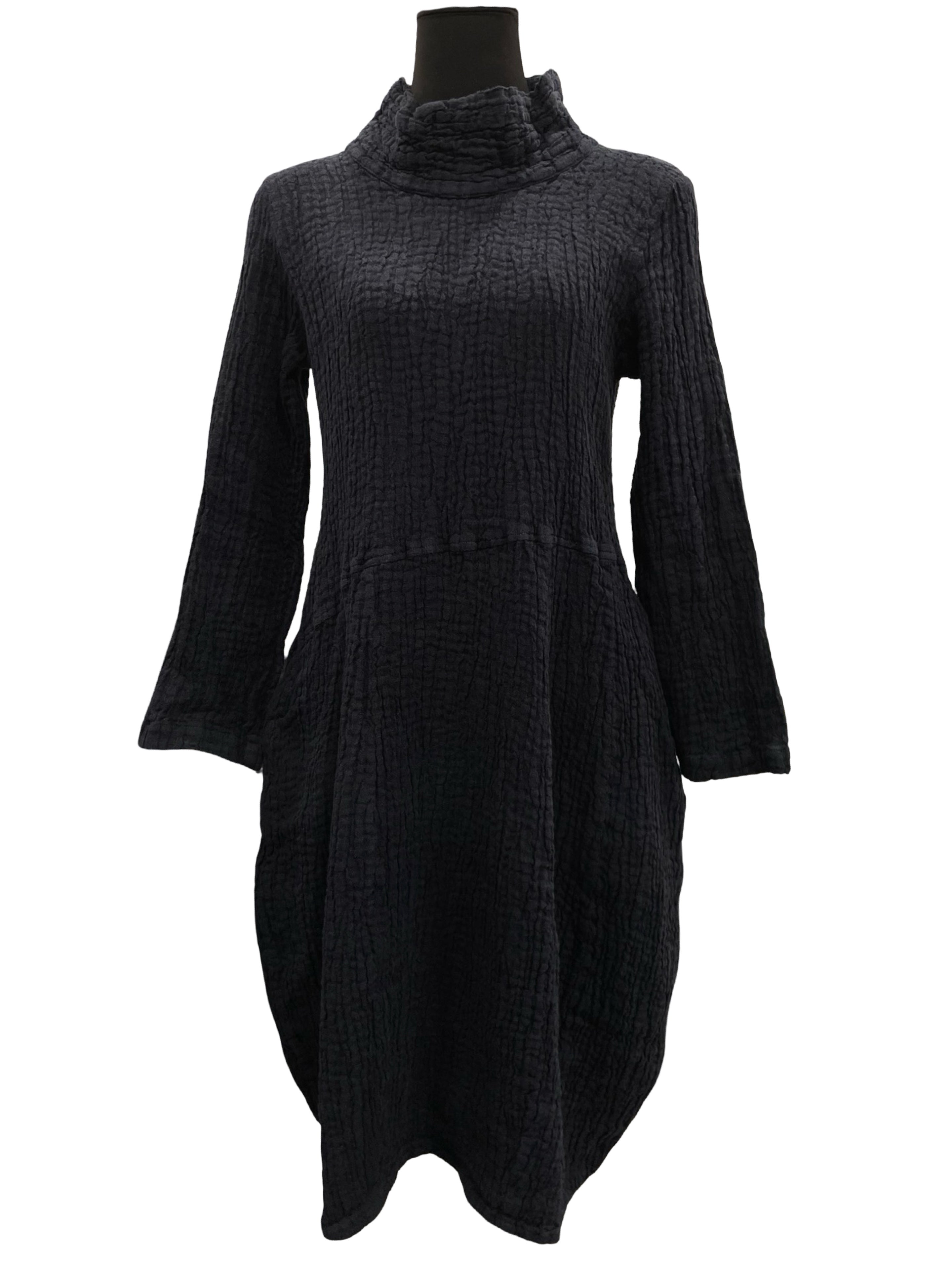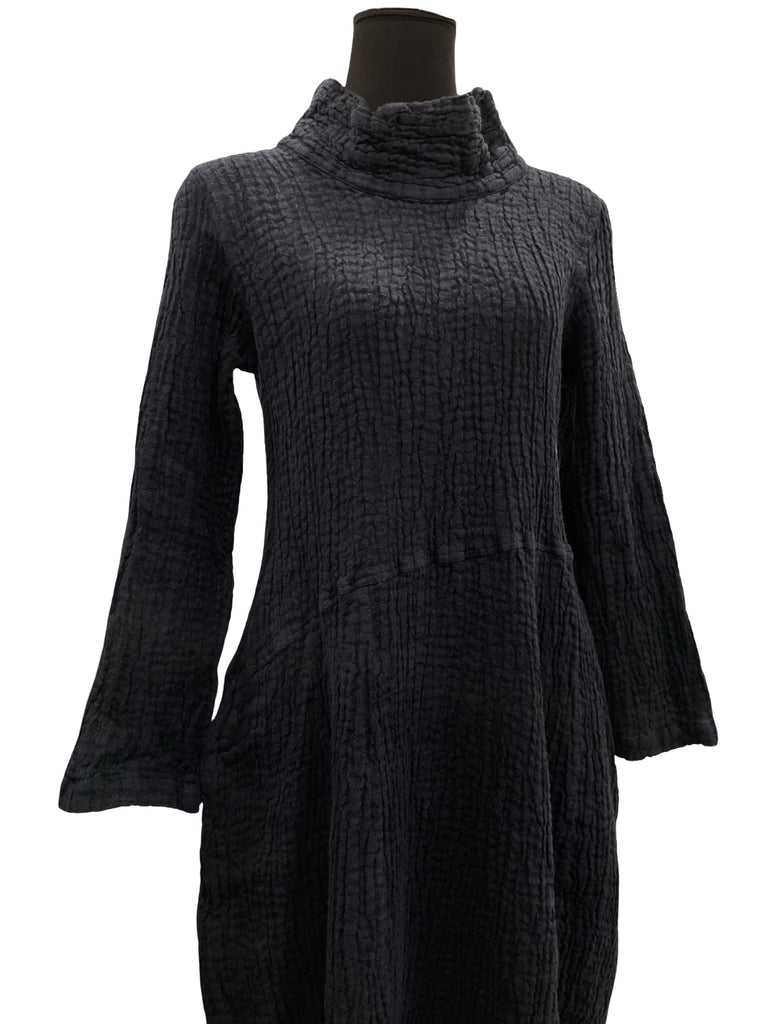 Extremely flattering textured cowl dress, featuring long sleeves, a bubble skirt, asymmetrical detailing, and crimped fabric that is fitted and loose in all the right places.