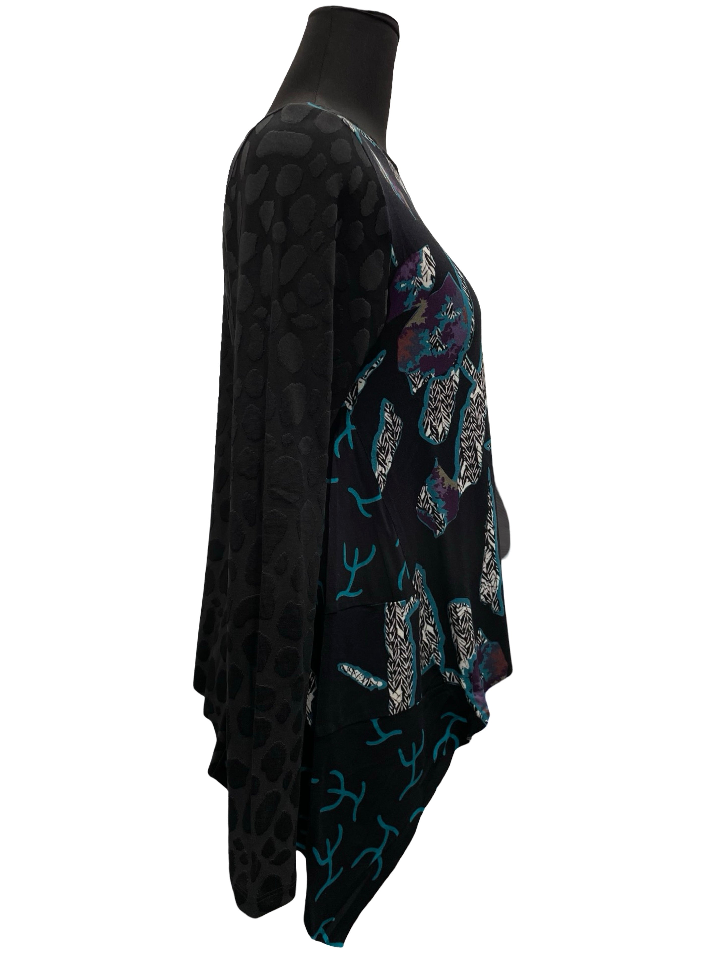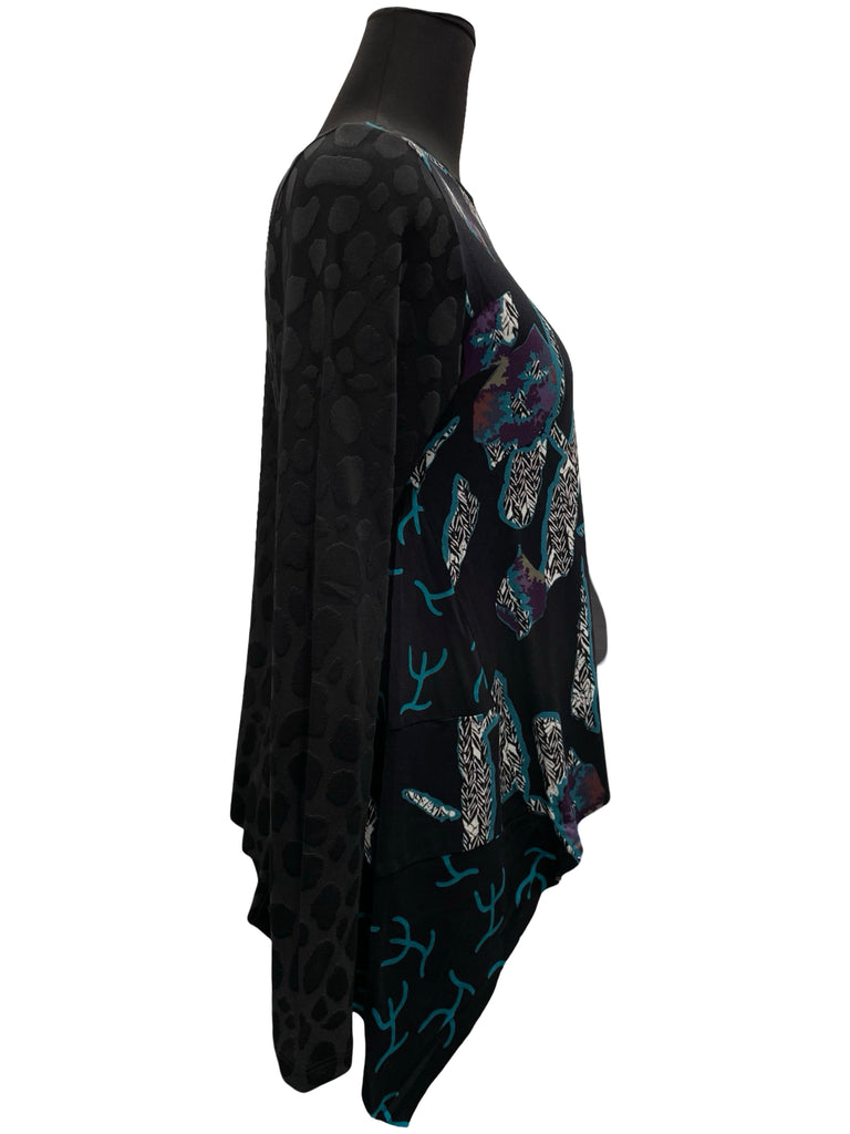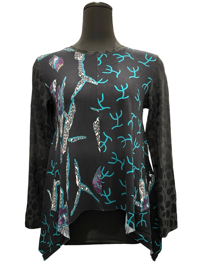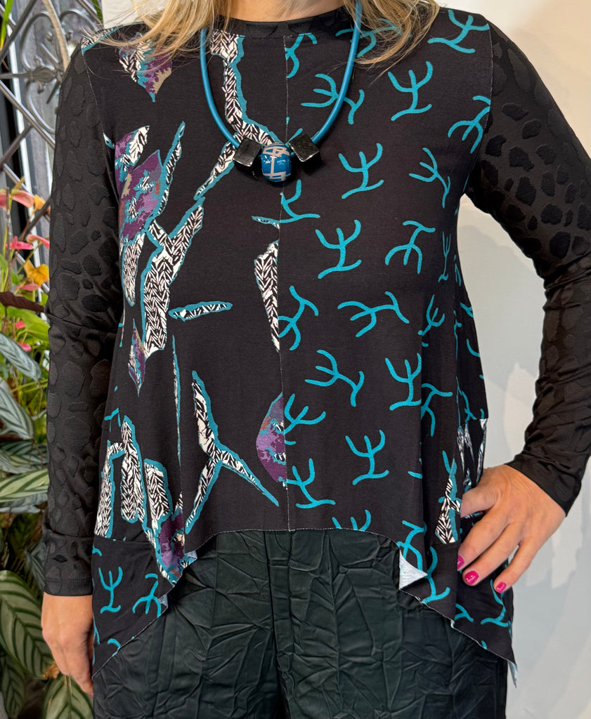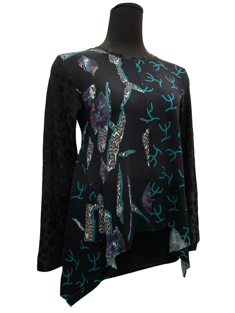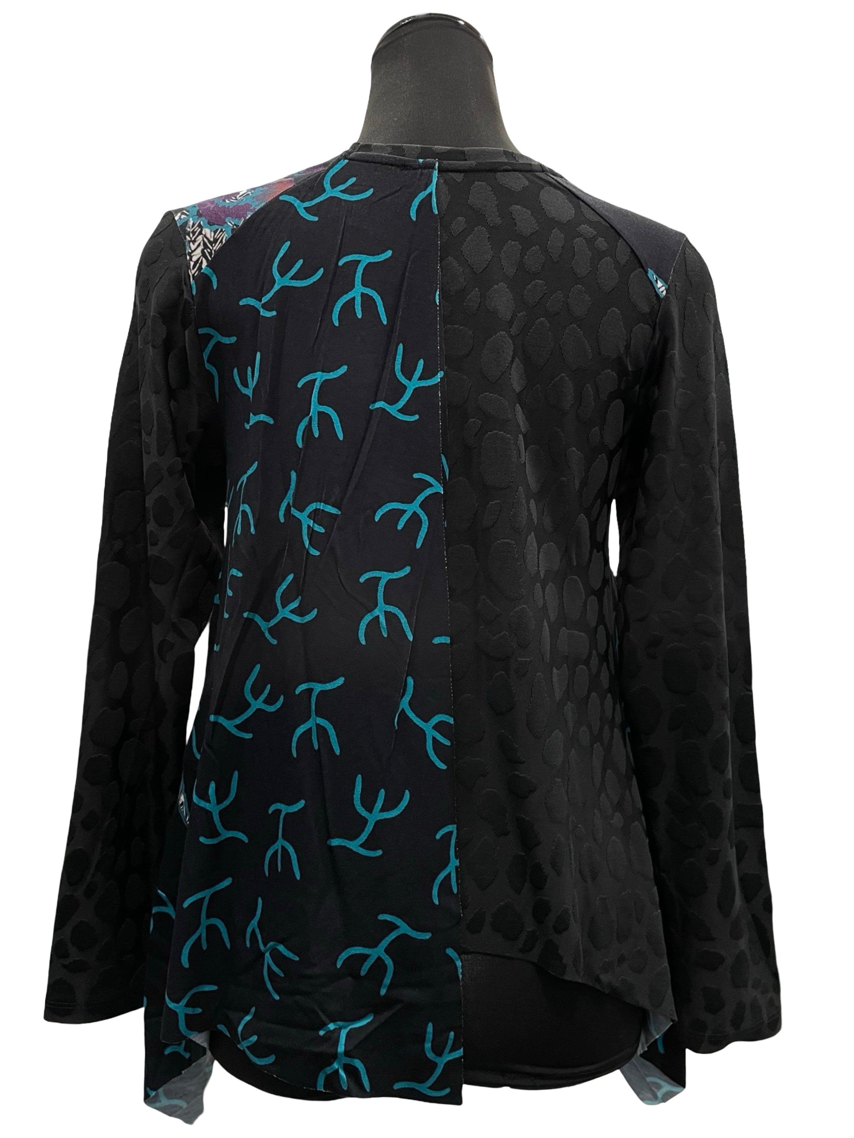 Super fun top with a horseshoe hem, made from multiple stylish fabrics. The round neck and back slit make this the perfect topper.