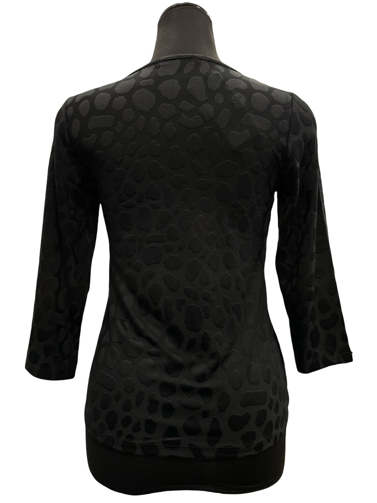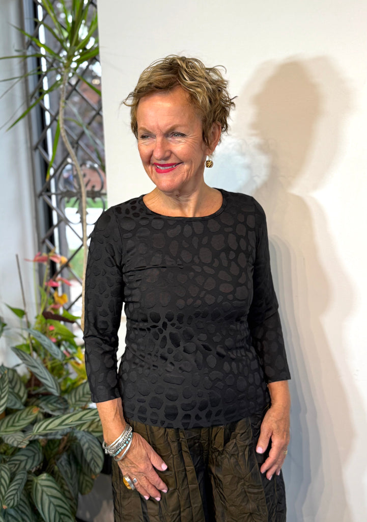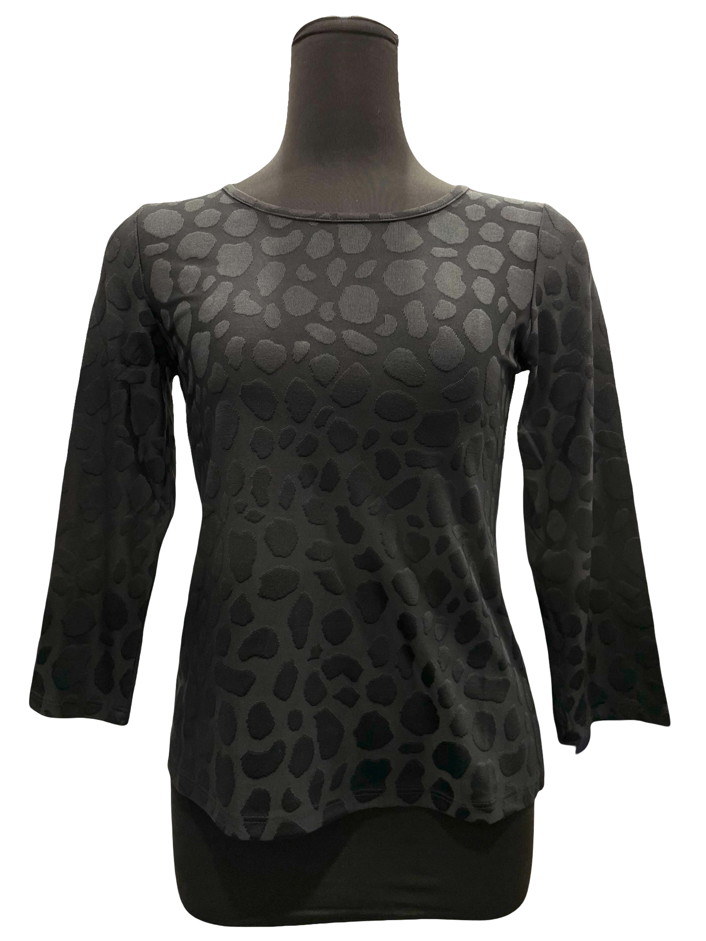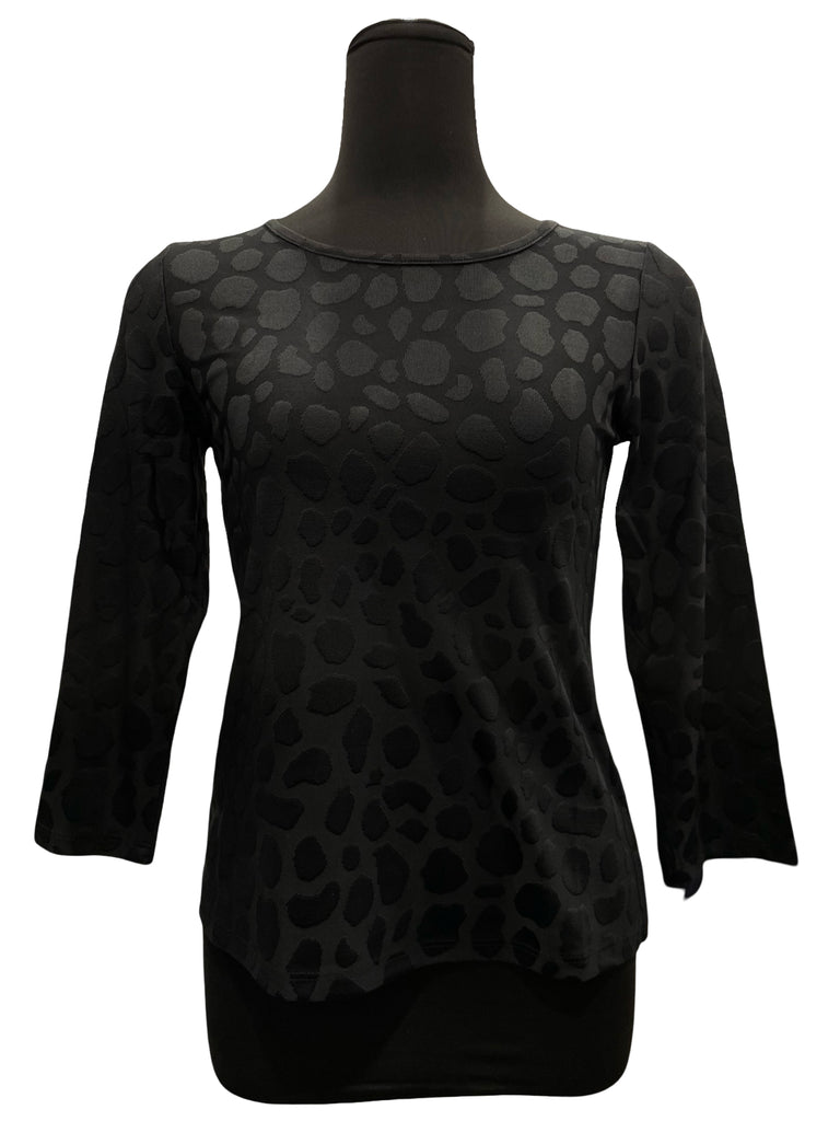 Super cute cropped length top with a round neck, 3/4 sleeves and a texture giraffe print.