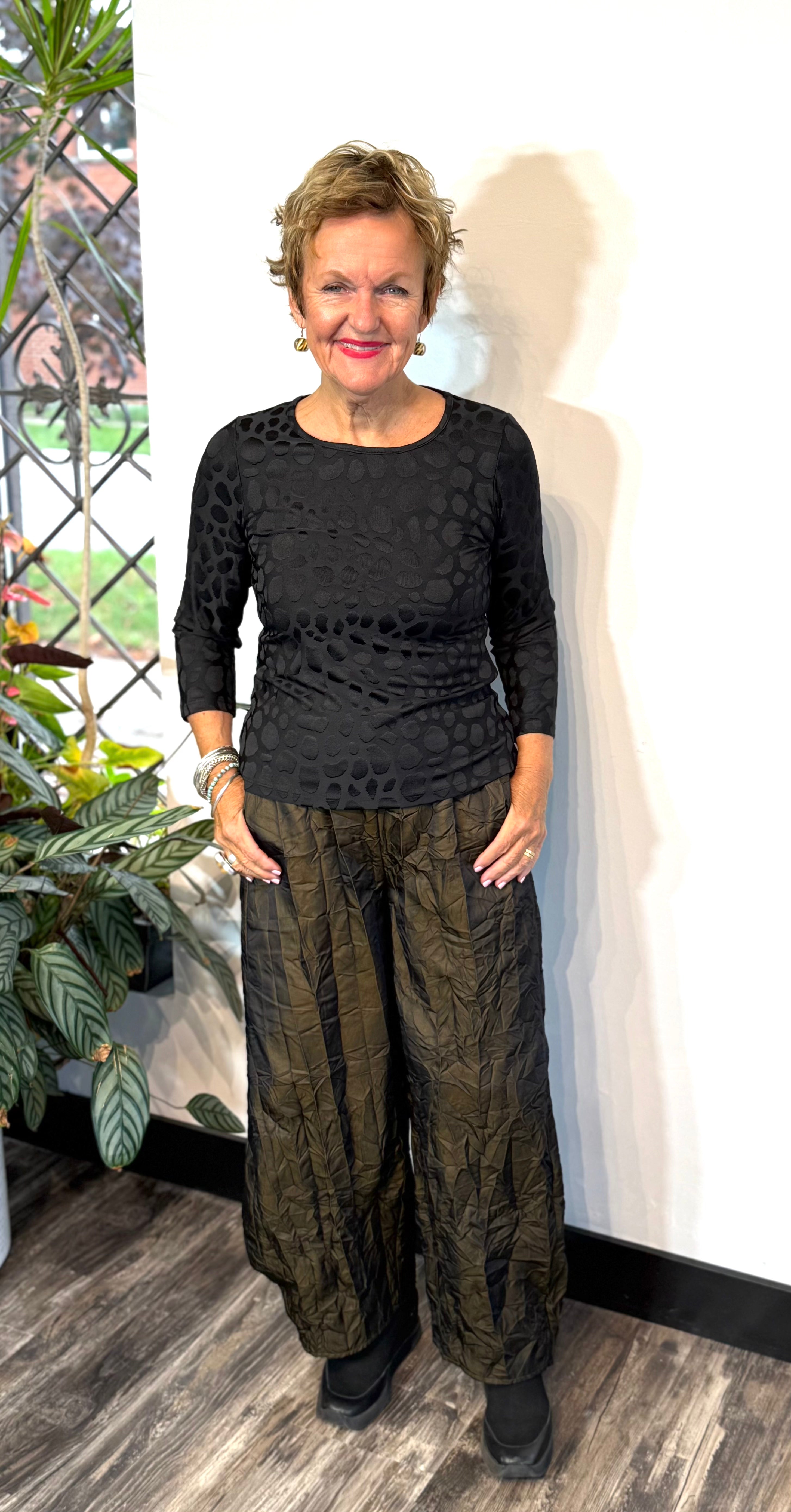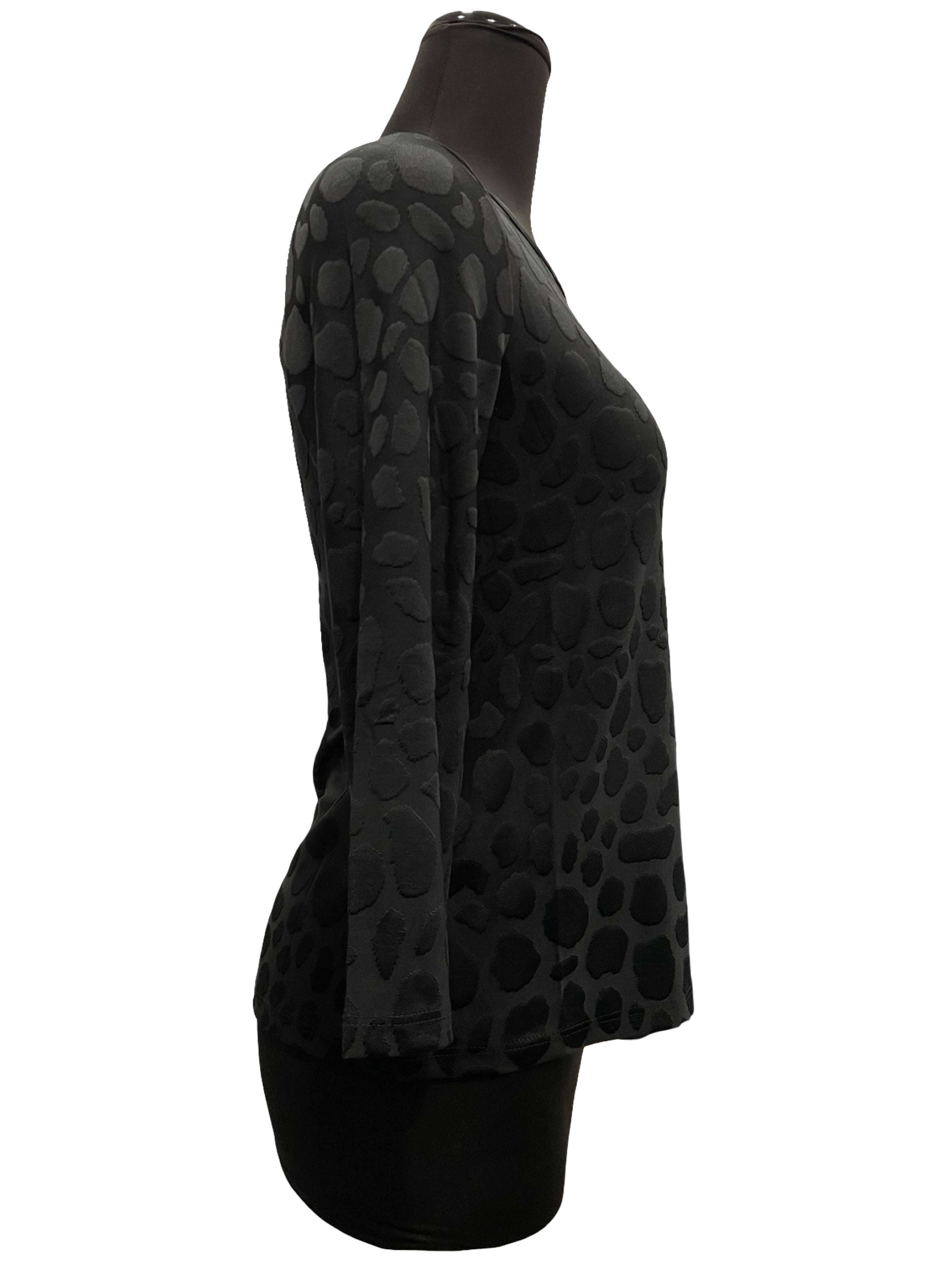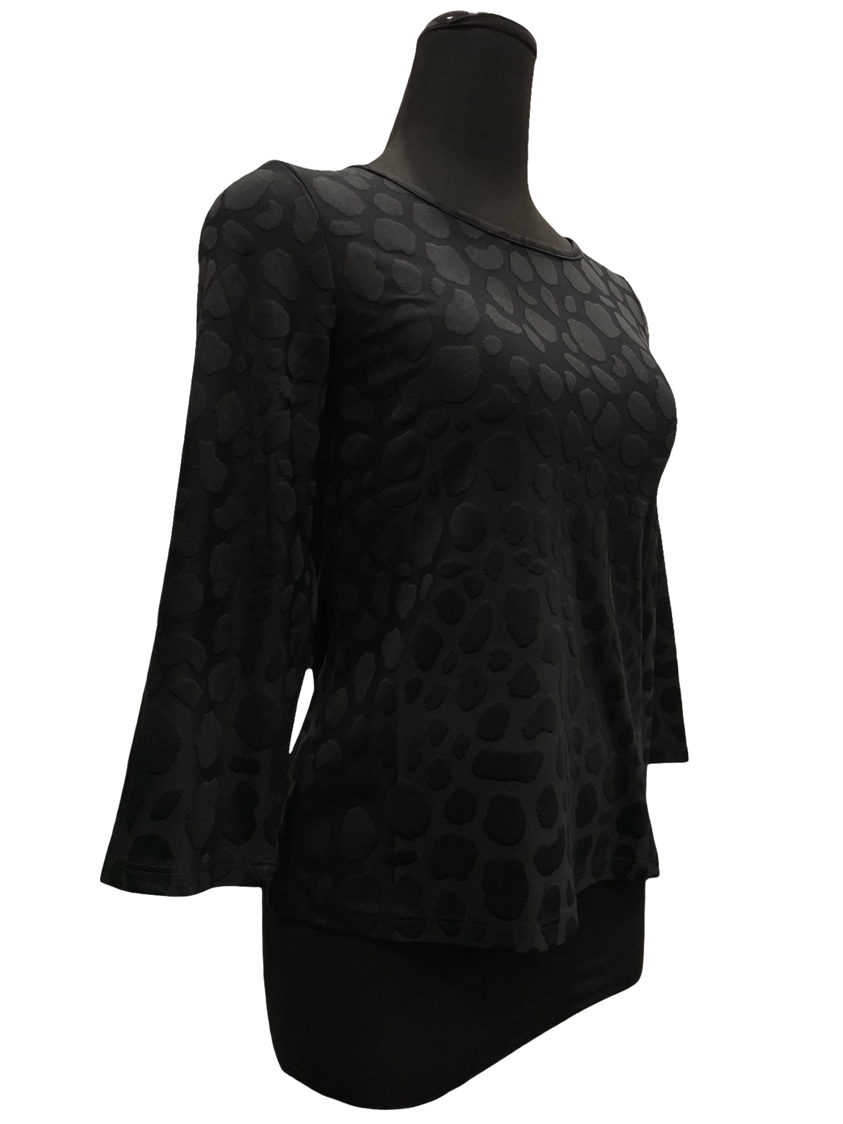 Super cute cropped length top with a round neck, 3/4 sleeves and a texture giraffe print.