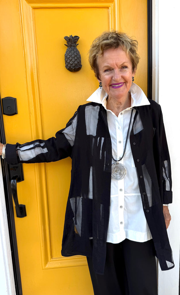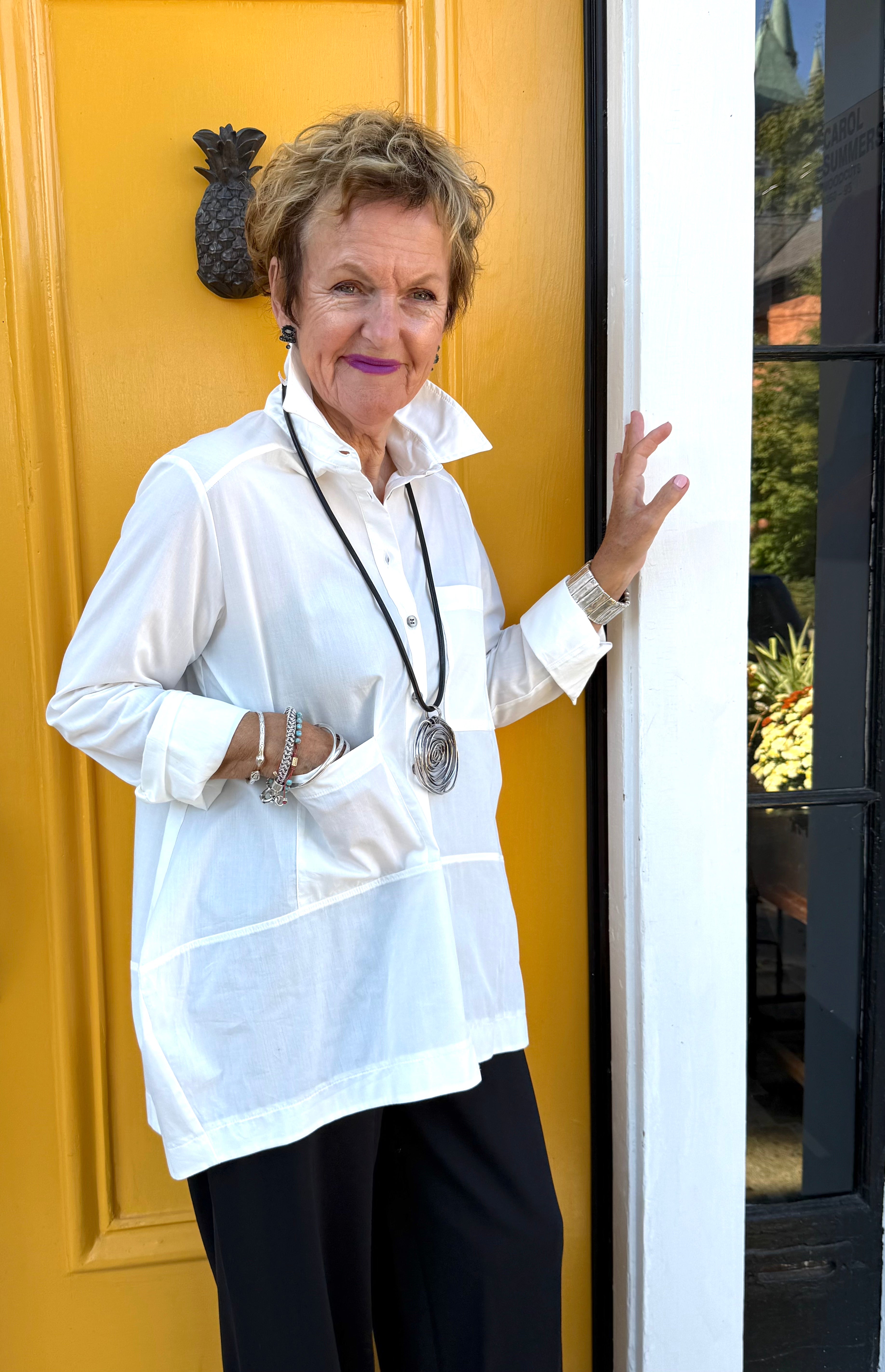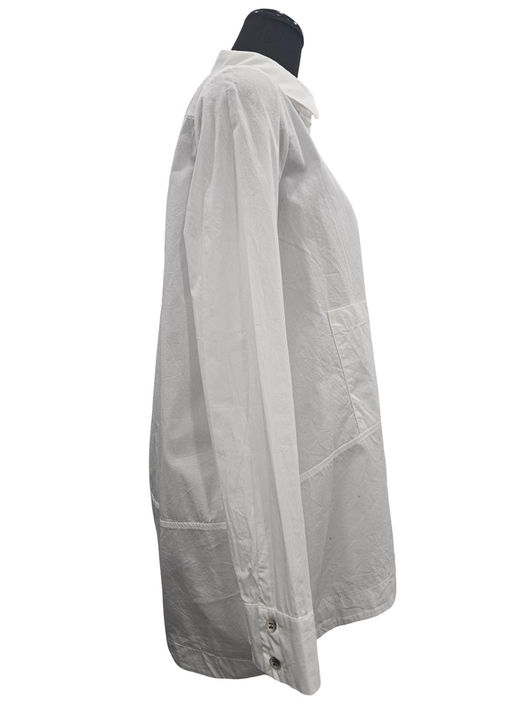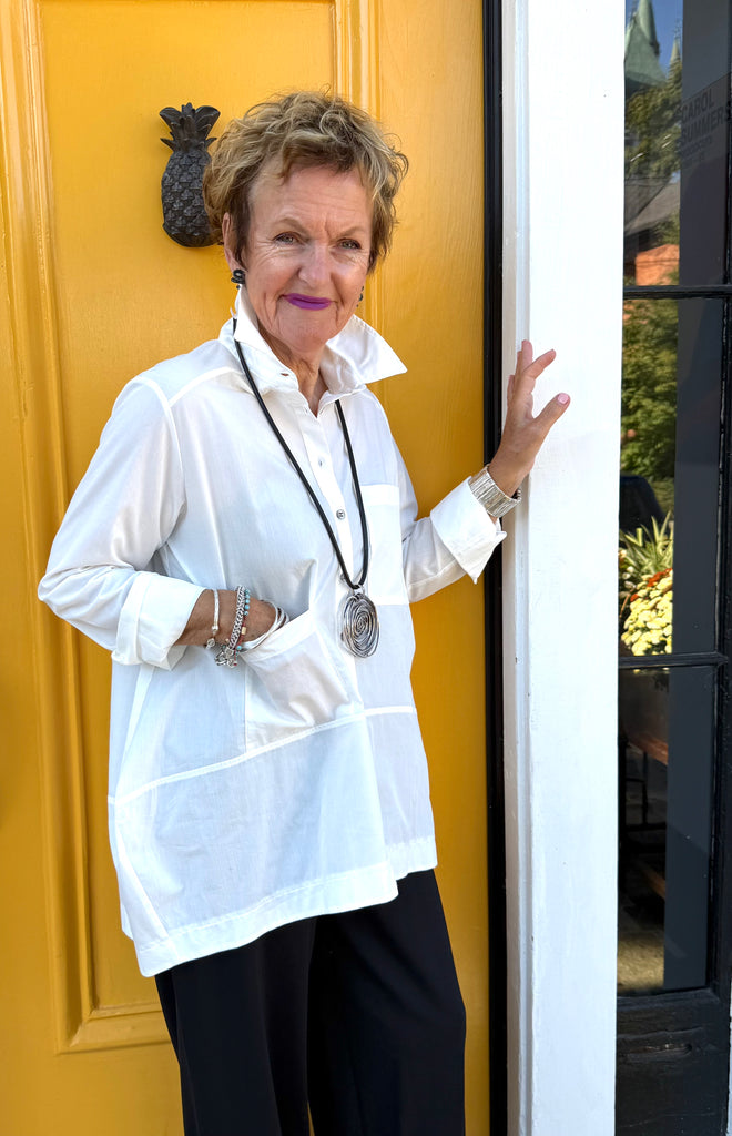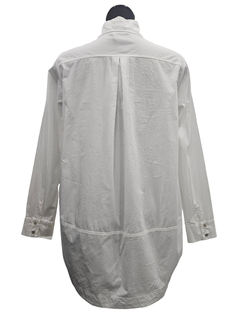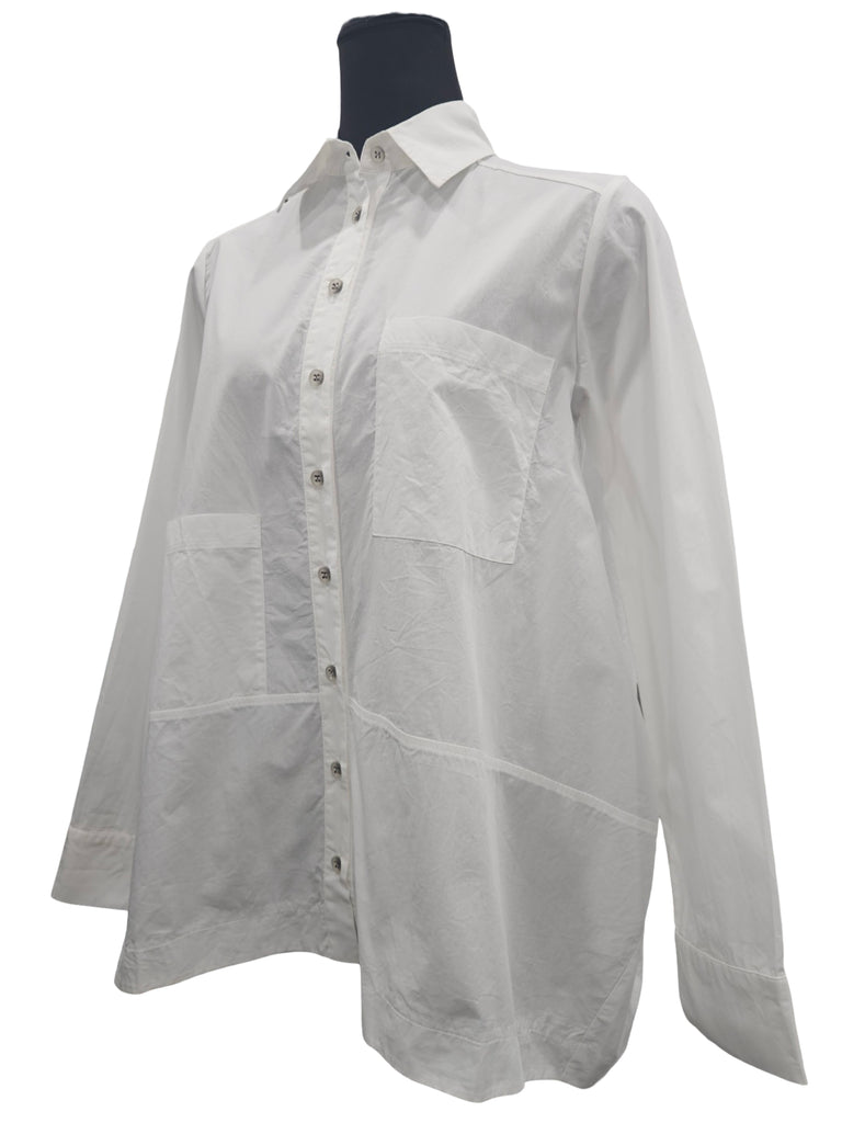 Super cute white collared shirt with asymmetrical pockets and beautiful detailing.