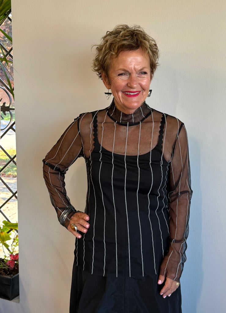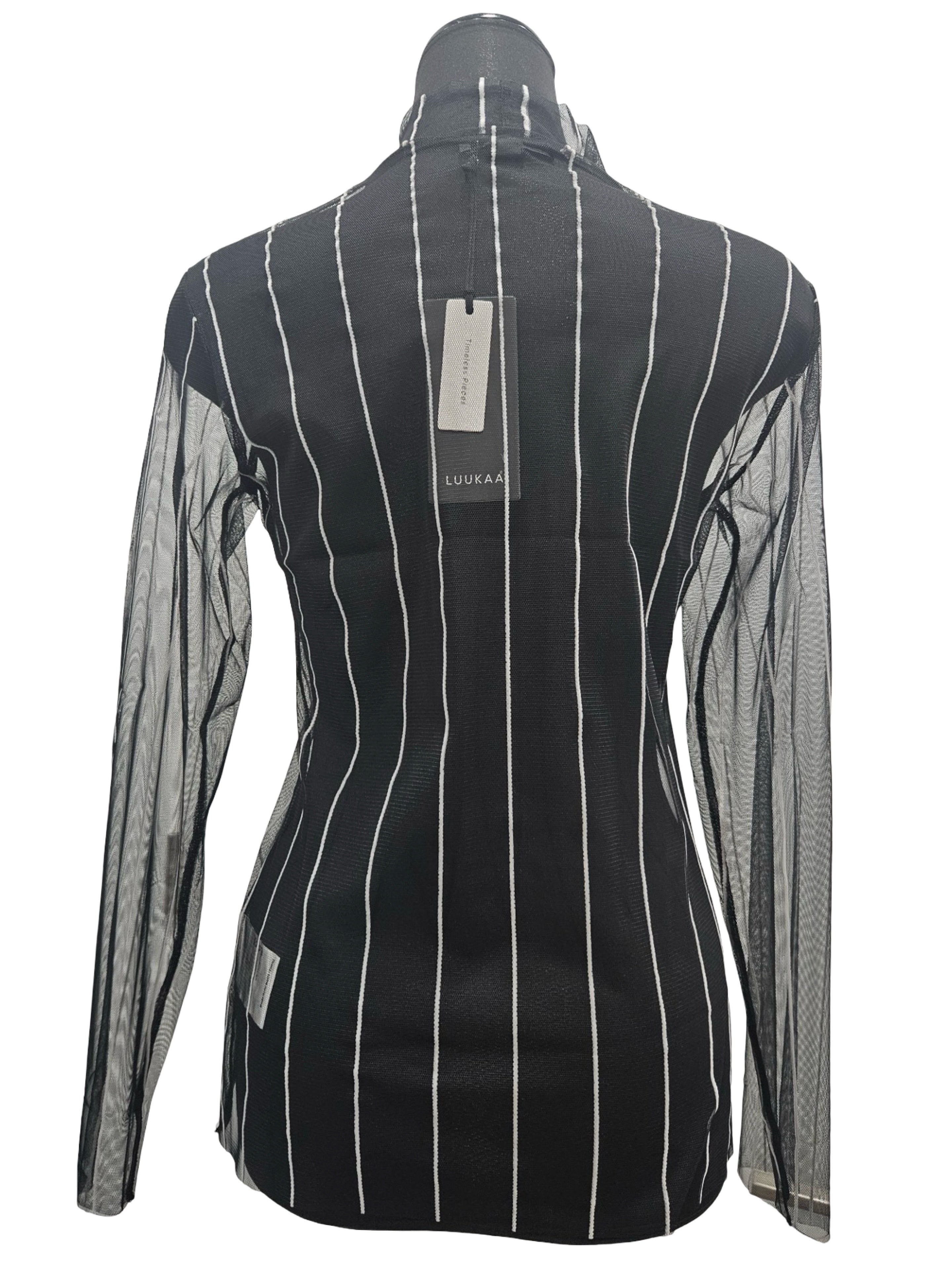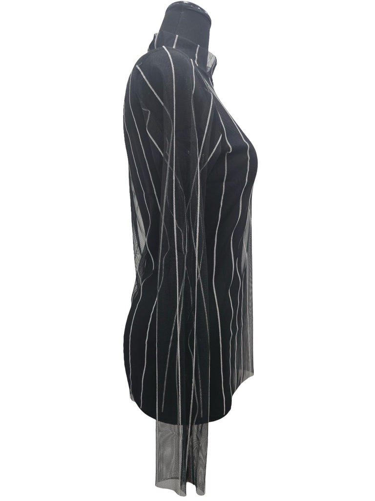 The perfect layering piece! This mesh top features black mesh, white stripe detailing, a turtleneck, and comfortable feel.