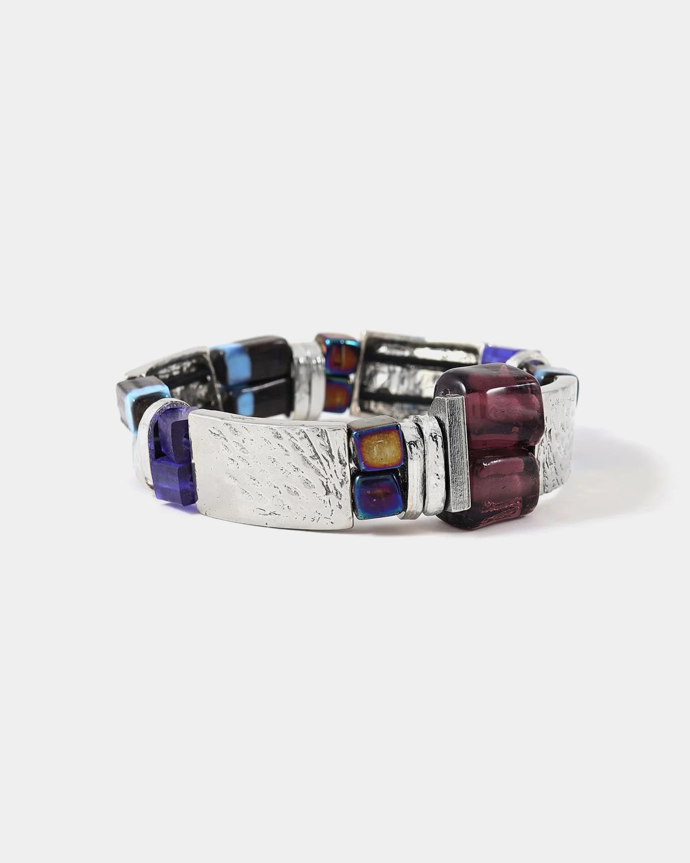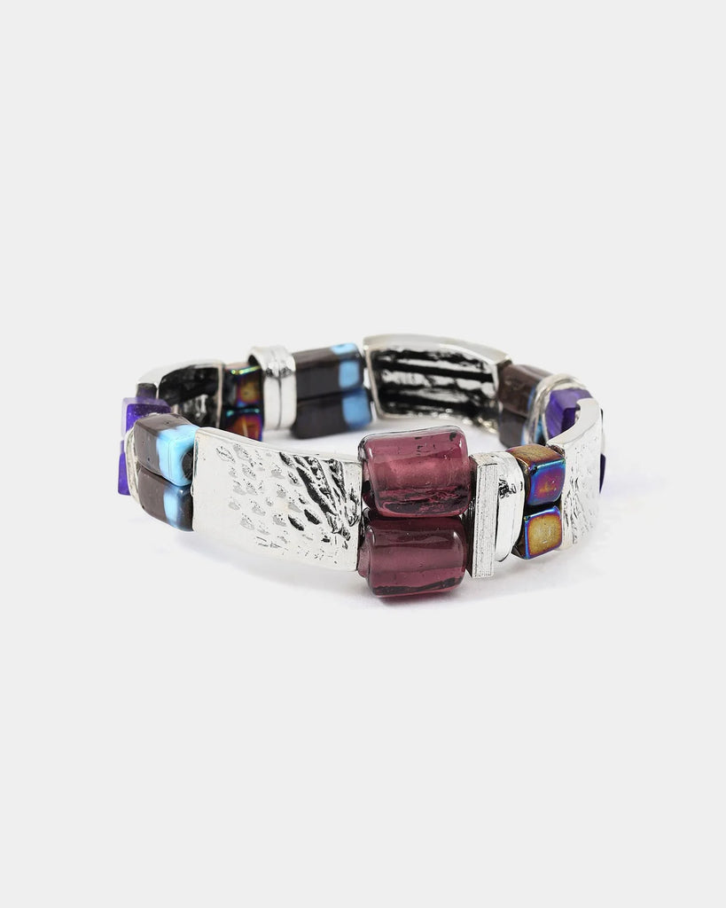 Maia is a bold elastic cuff, designed as a rhythmic, graphic composition. A geometric interplay of natural or 22K gold-plated pewter and colored glass, where hammered textures, sculpted beads, and textured medallions come together in a vibrant contrast. Compact yet expressive, this bracelet catches the eye and moves with strength and dimension.