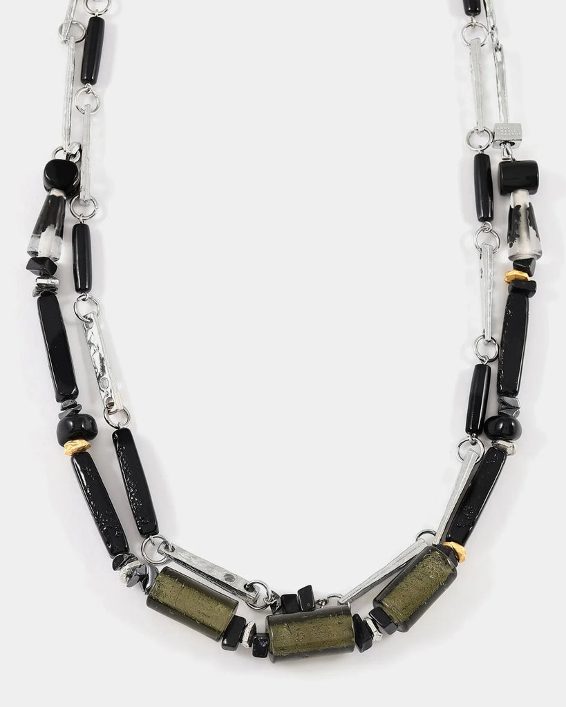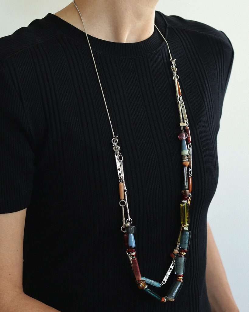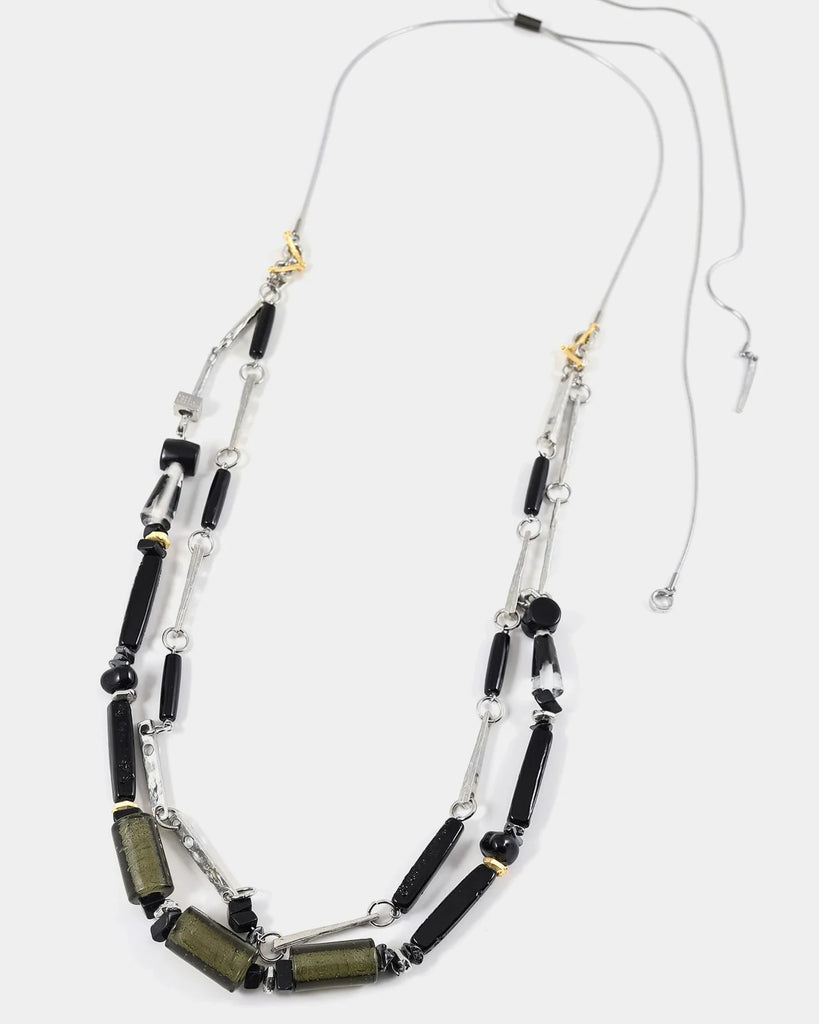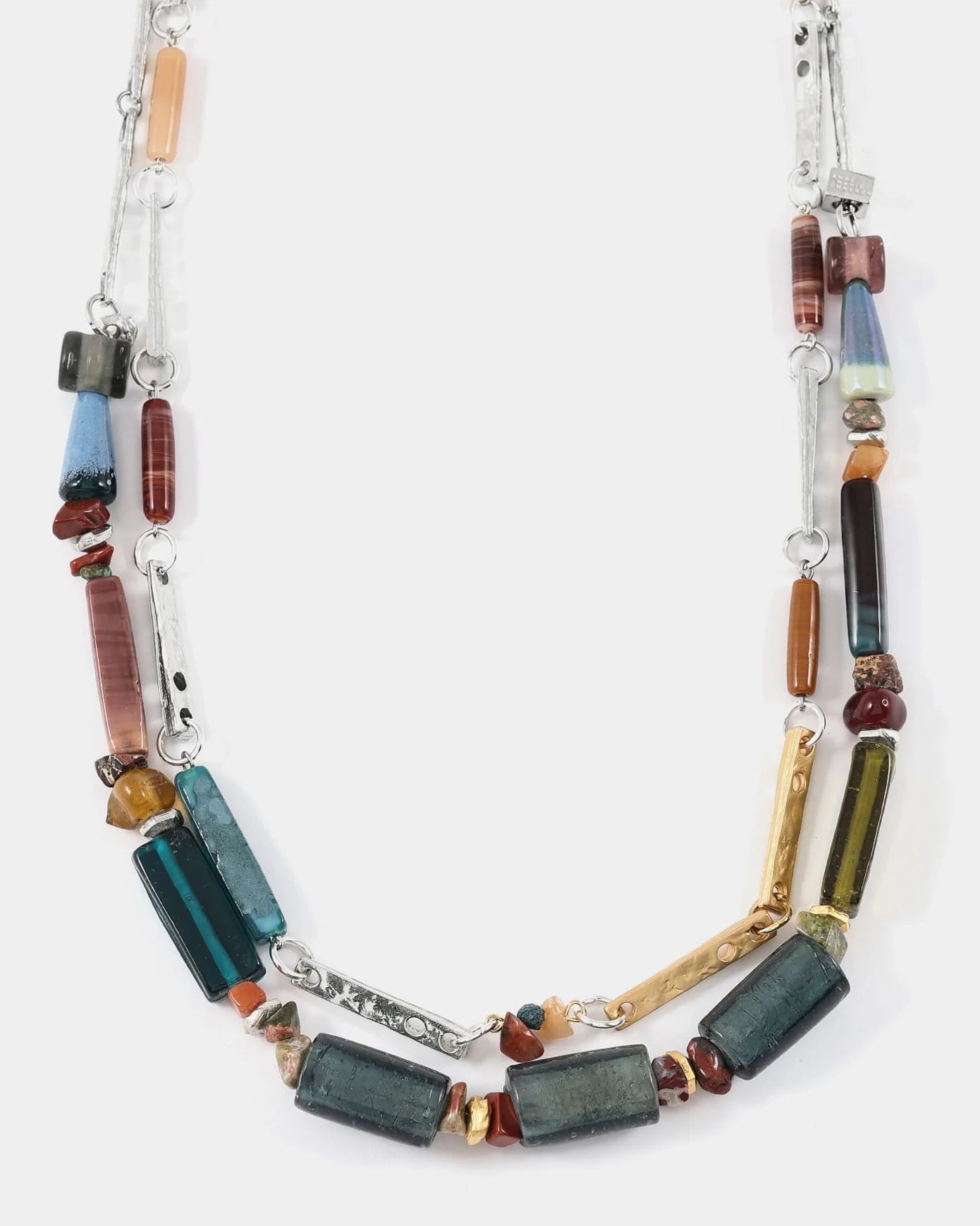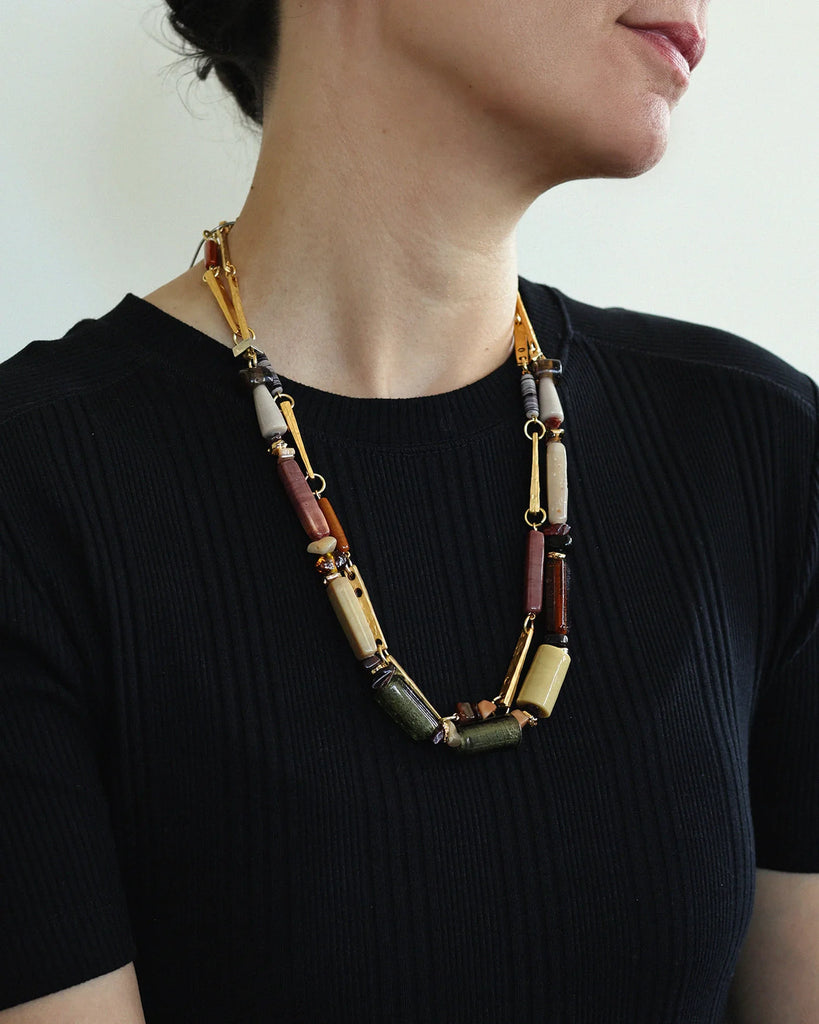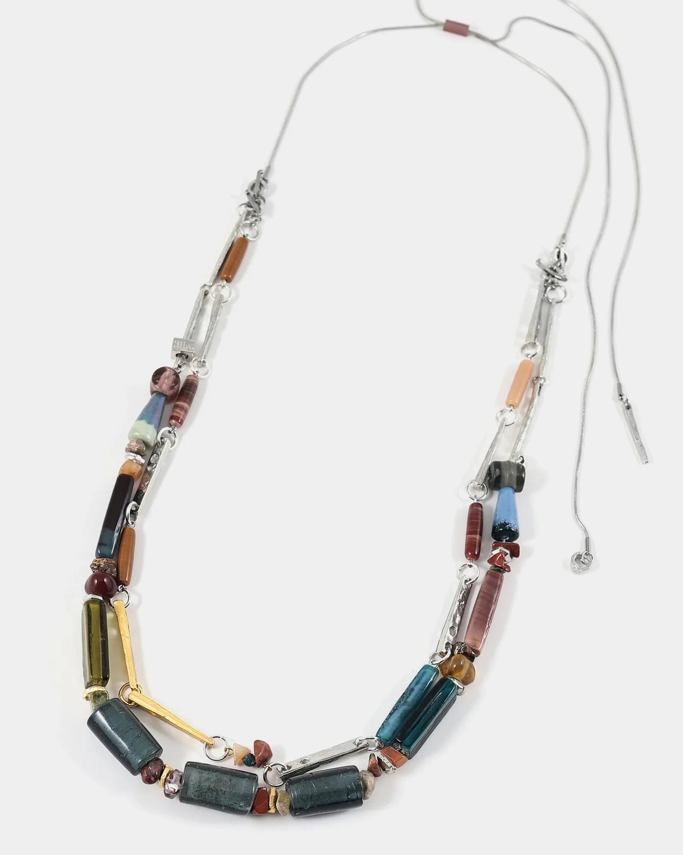 Zaniah is a bold, adjustable long necklace designed as a wearable star map. Featuring two layered chains and detachable segments linked by toggle clasps, it invites endless customization. Contrasting natural stones — quartz, agate, jasper — evoke inner strength, interwoven with fragments of colorful glass beads and raw or 22K gold-plated pewter to create a vibrant visual rhythm. Finished with a sliding clasp on a stainless steel chain, Zaniah gracefully adapts to your silhouette, bringing fluid elegance to any look.