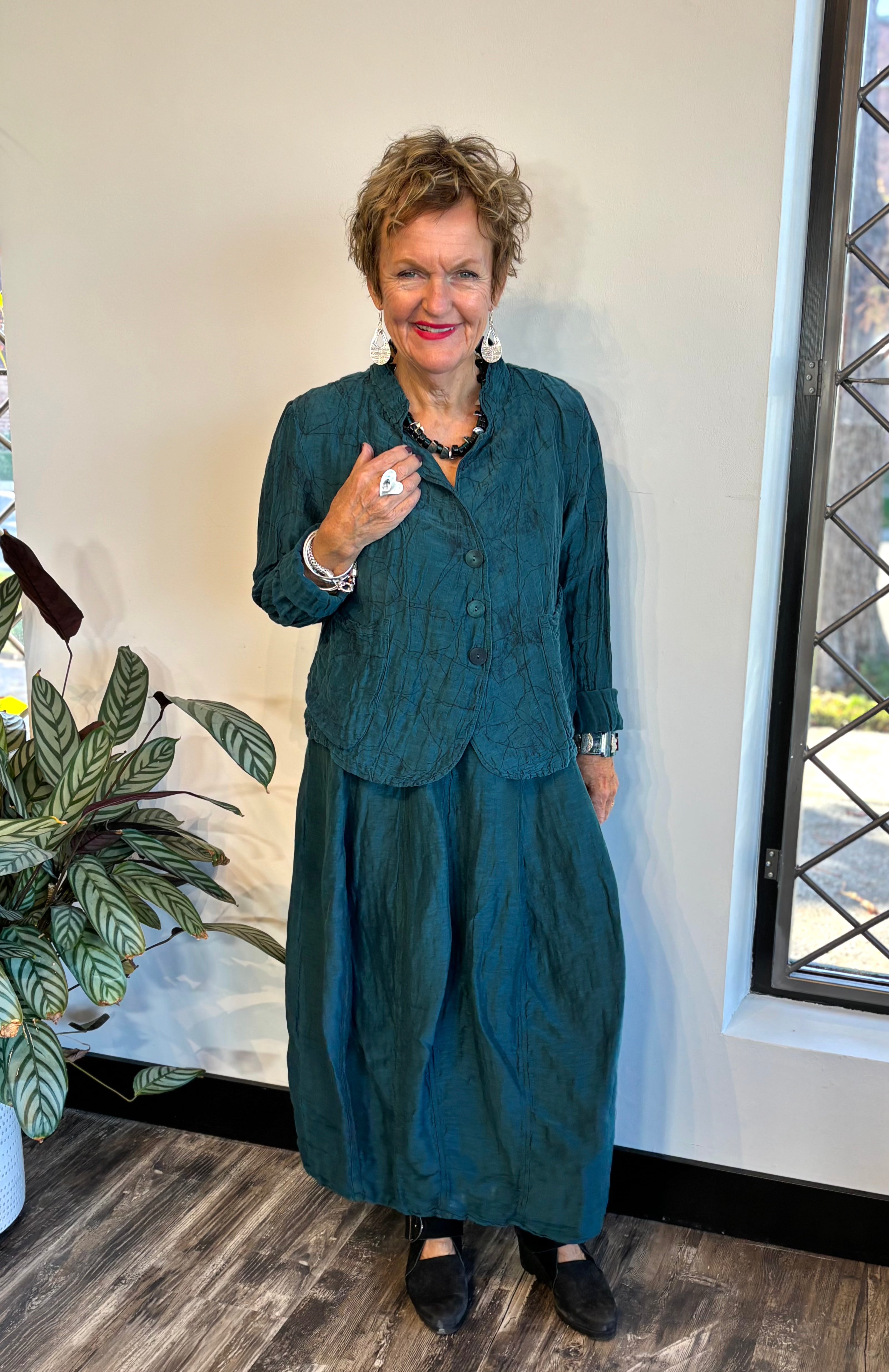 One of Grizas' signature styles is now available in this stunning peacock teal colour with an intricate print. Pure comfort and elegance.