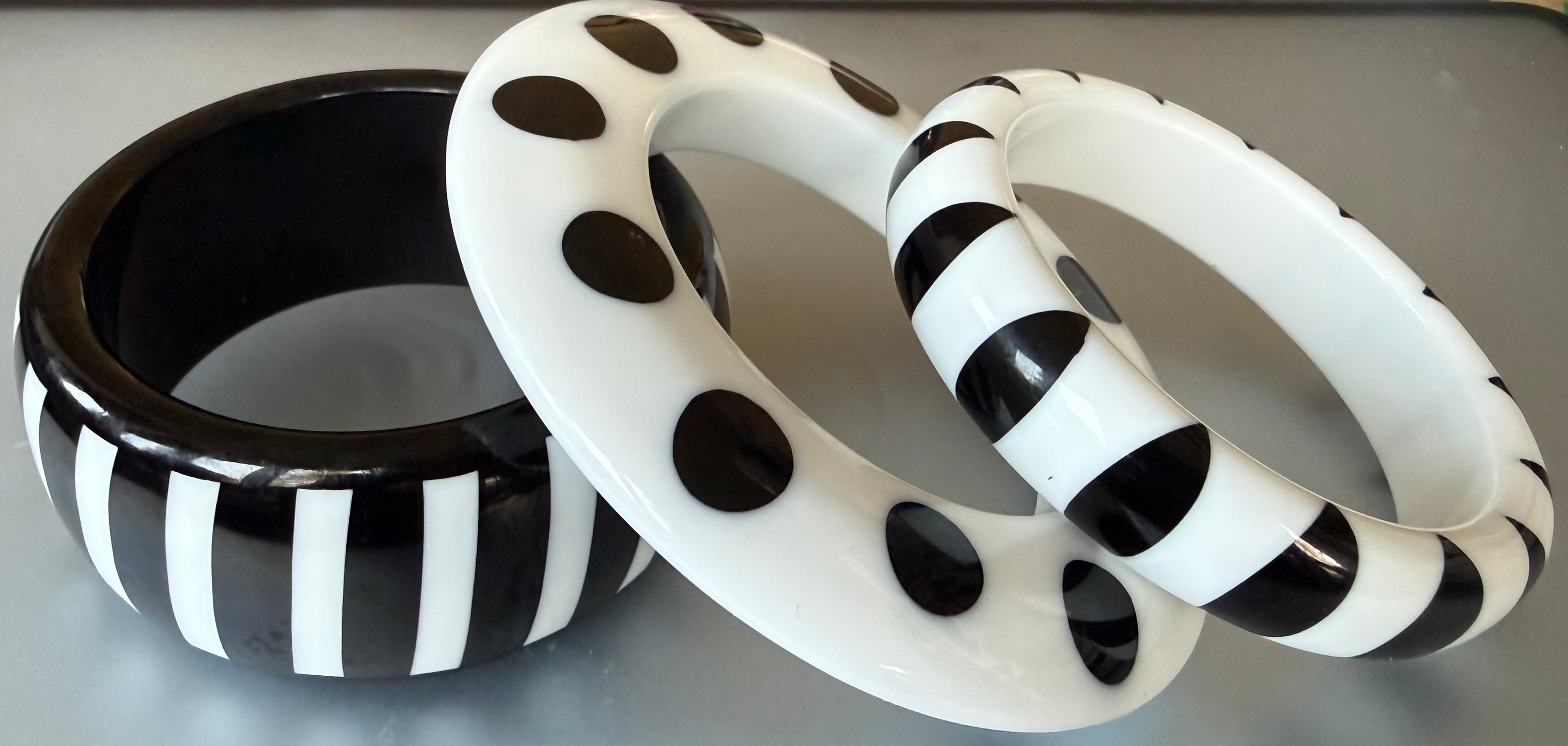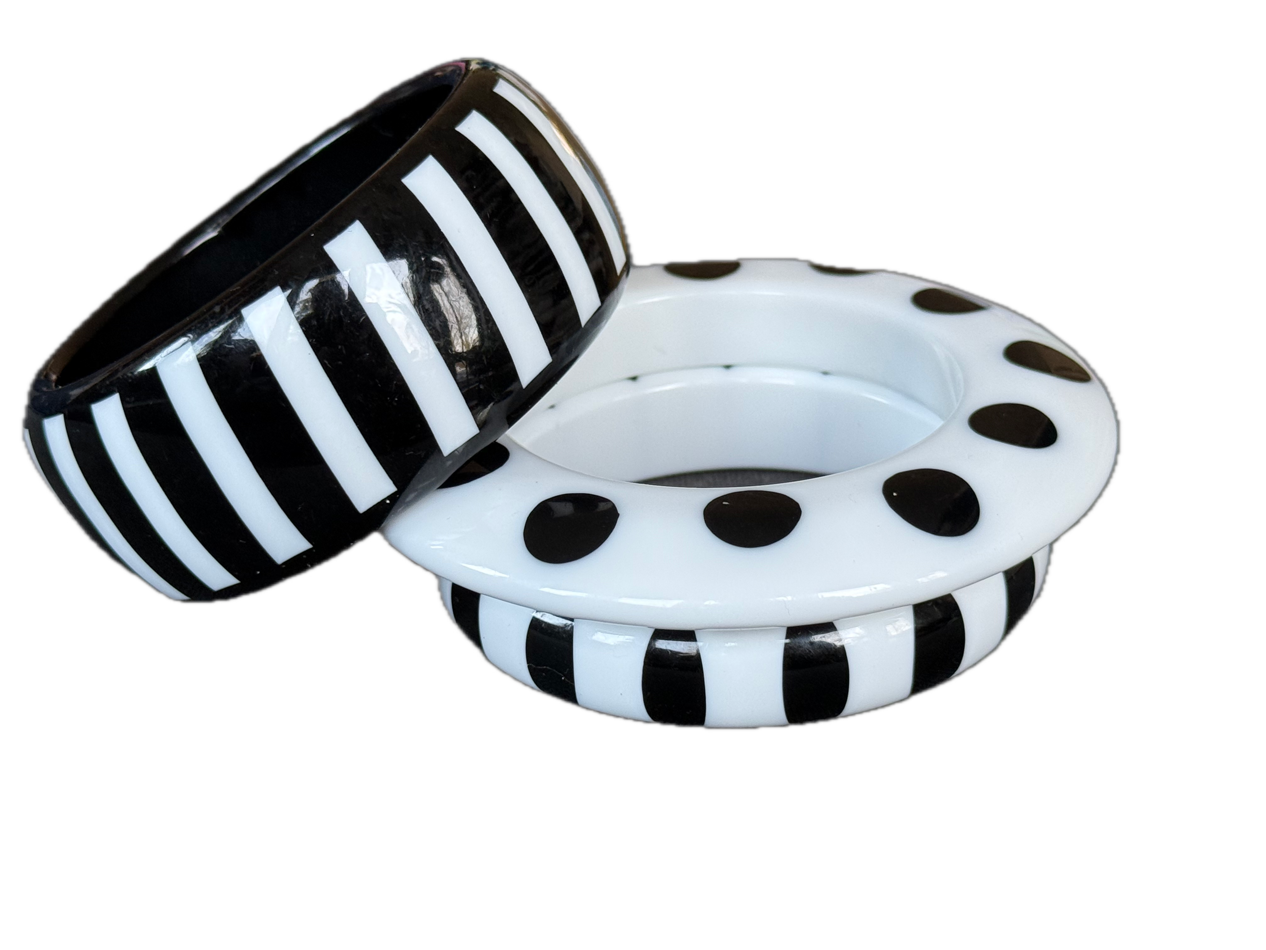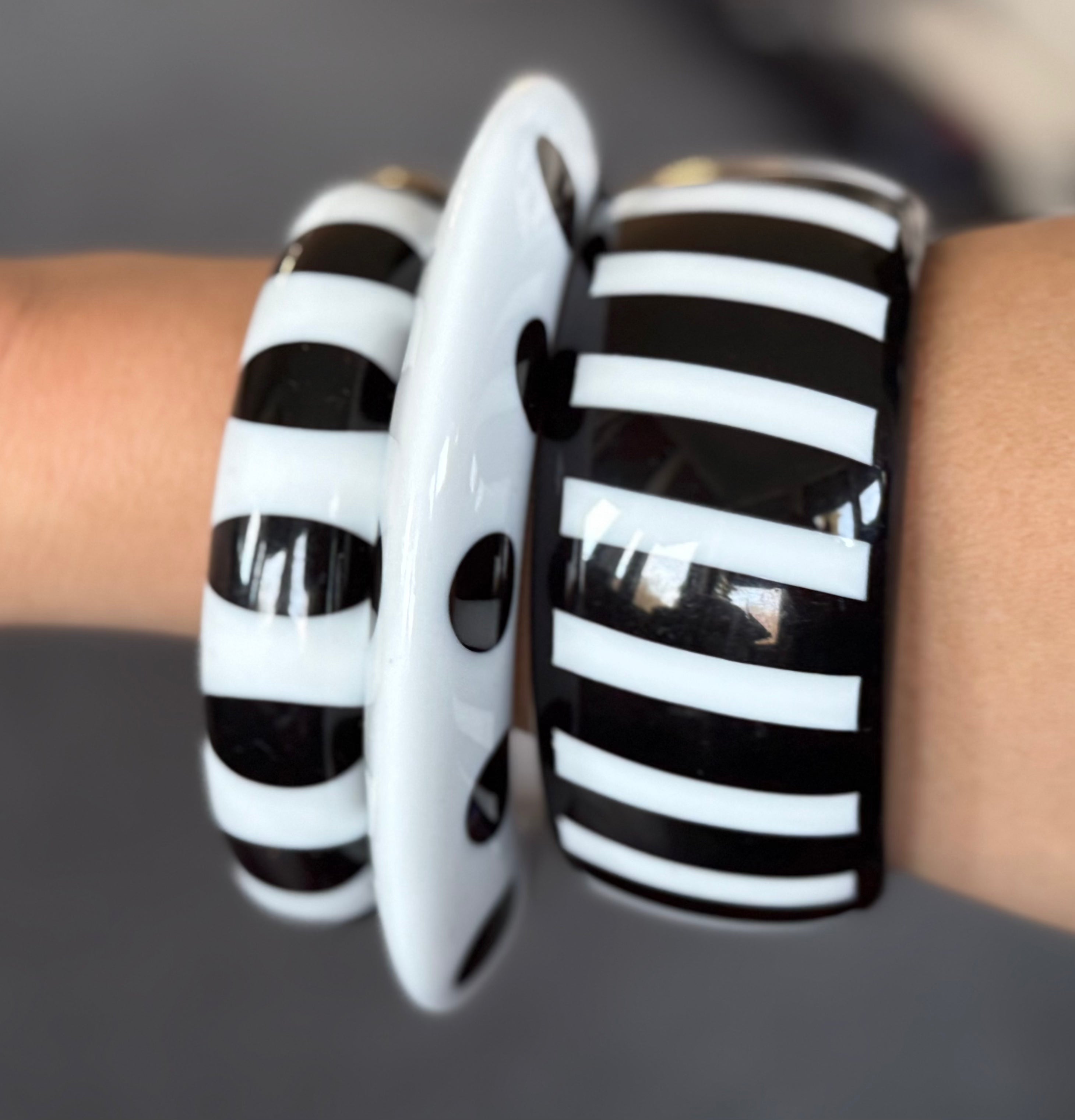 Thick resin bracelets in three classic designs. L&B Loves their stripes and dots. No better combo than black & white