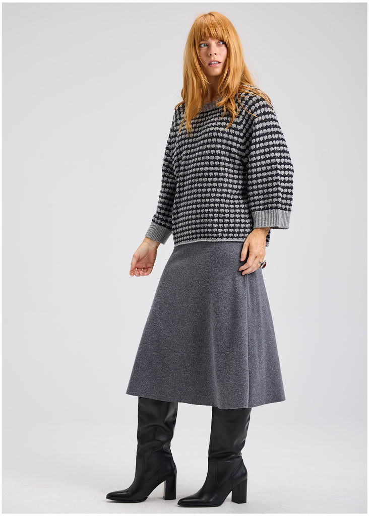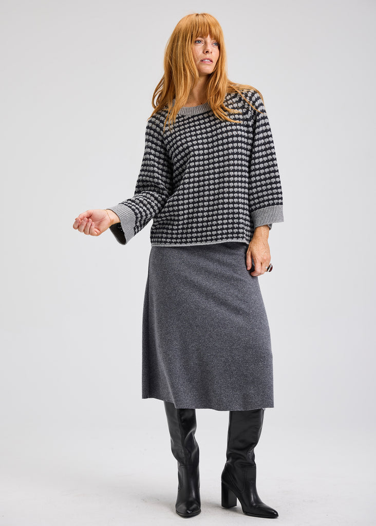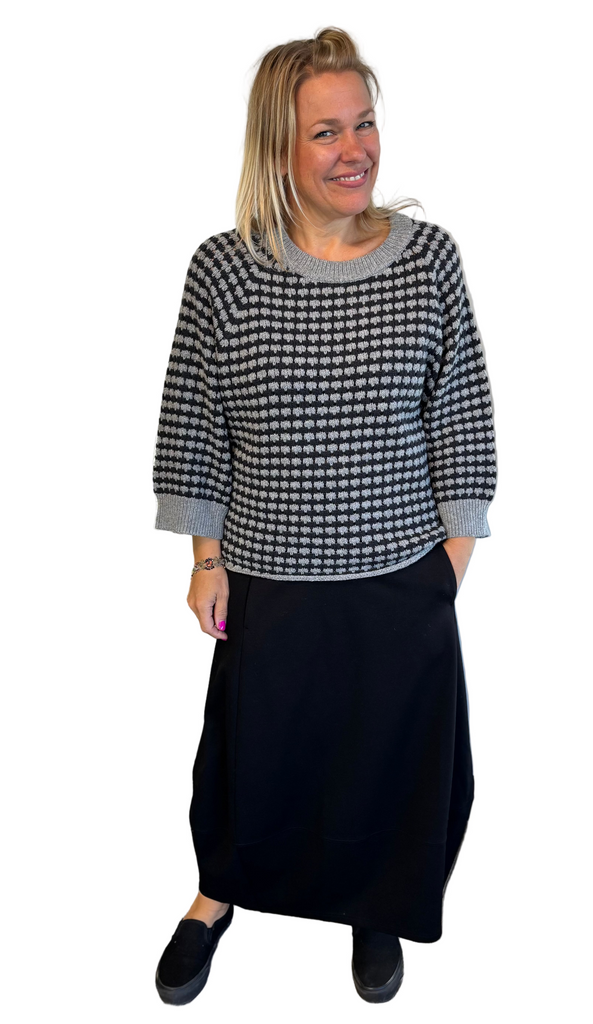 Stunning sweater, perfect on its own or as a topper, and ready for fall. Features a stunning grey/black textured check patter, wide hems on the neck and sleeves and a thicker knit to keep you warm as we descend into cooler weather.