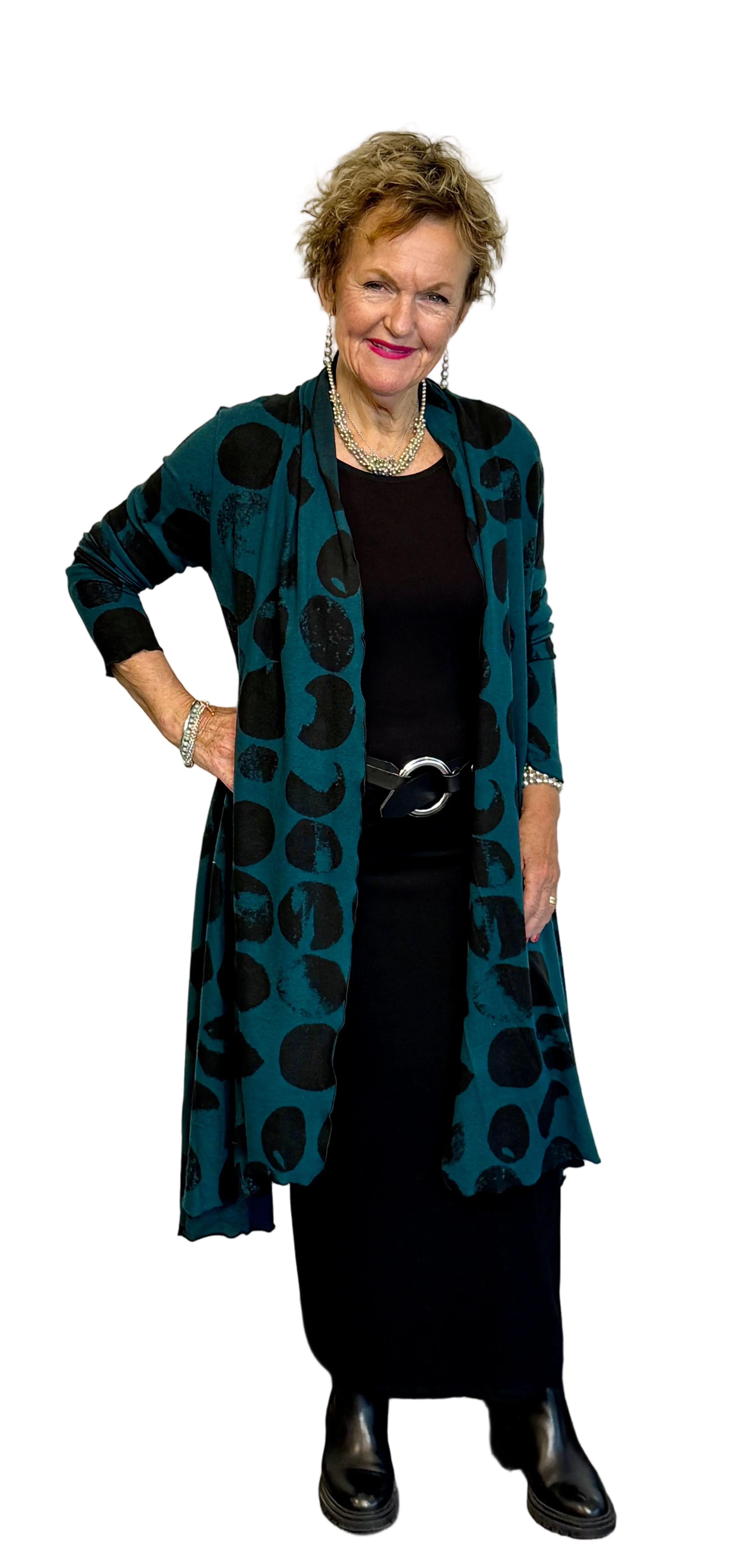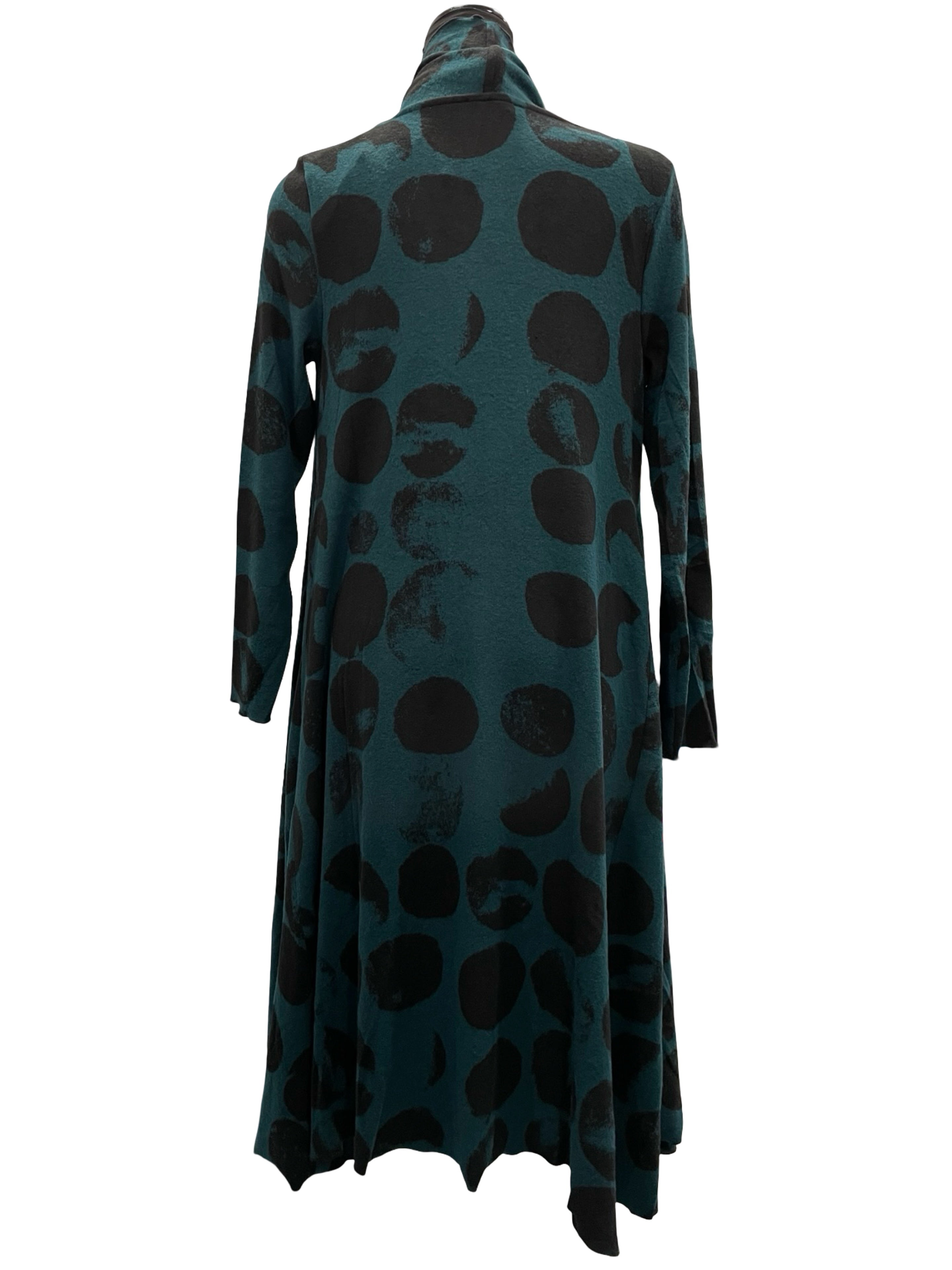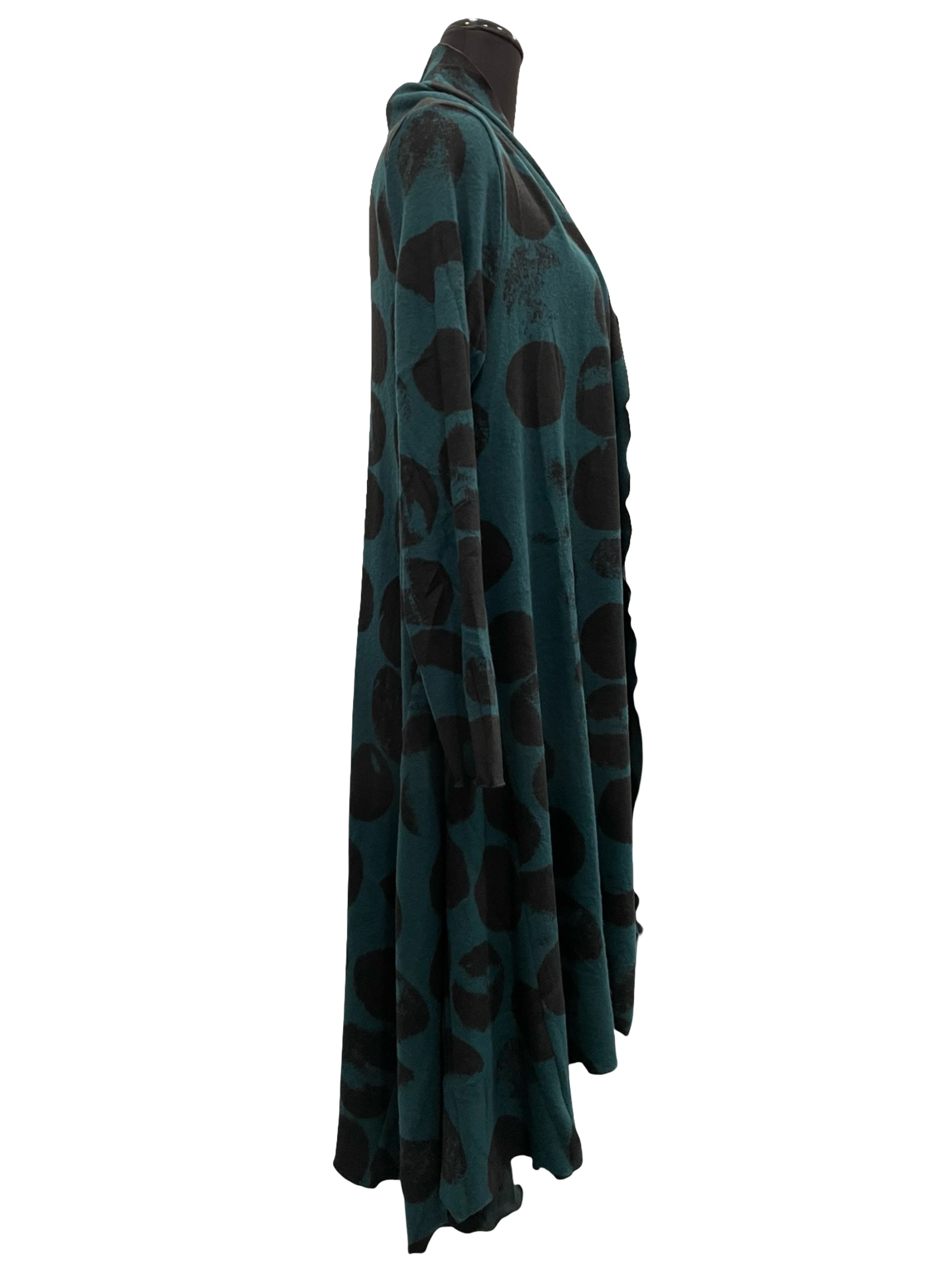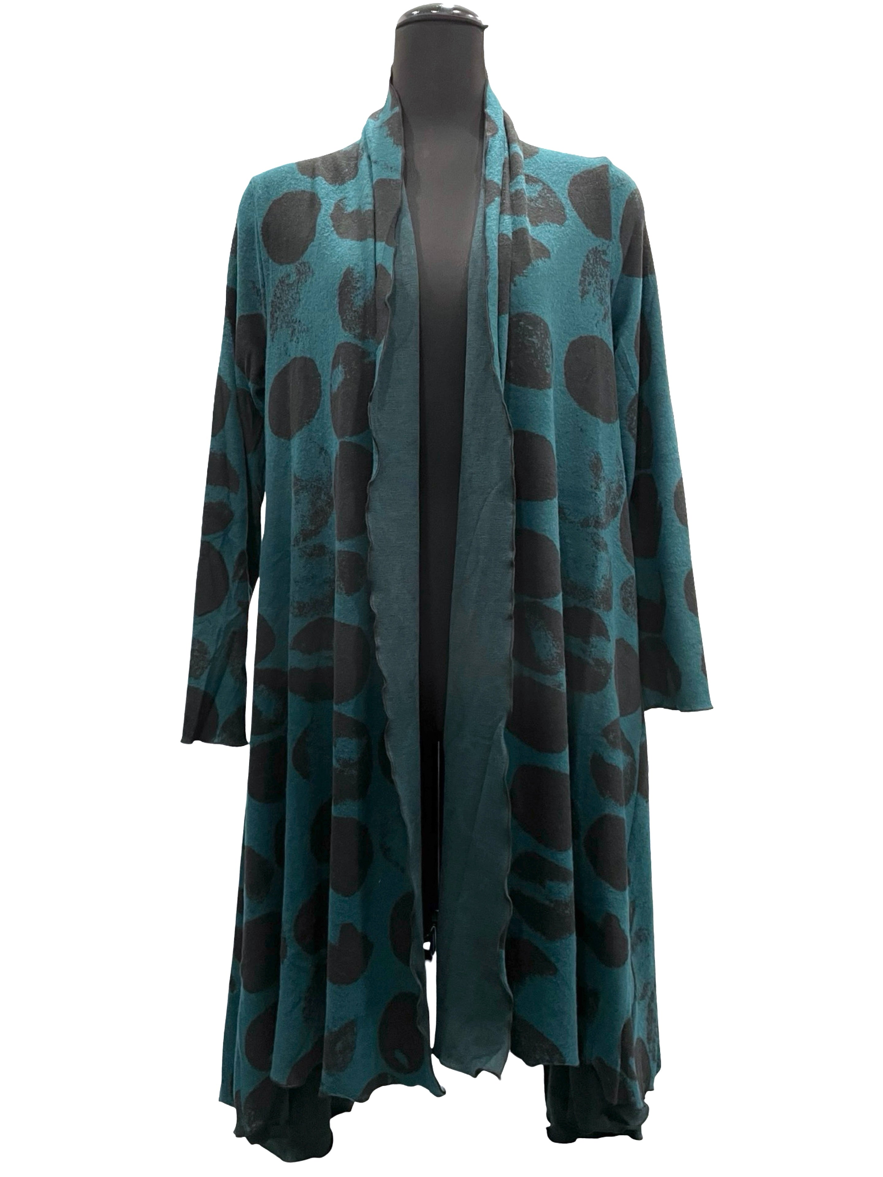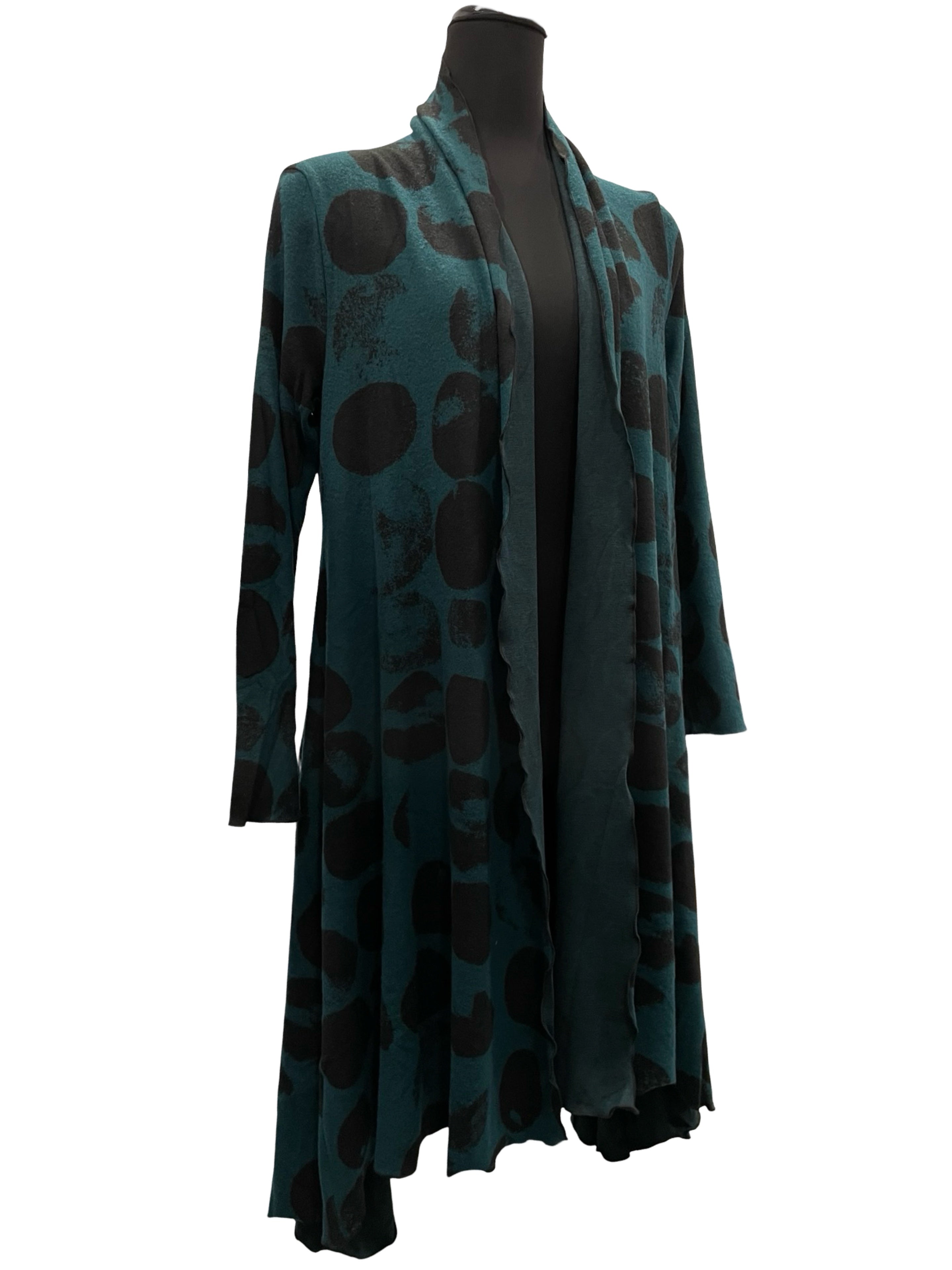 Flattering cardigan in soft patterned teal and black fabric.