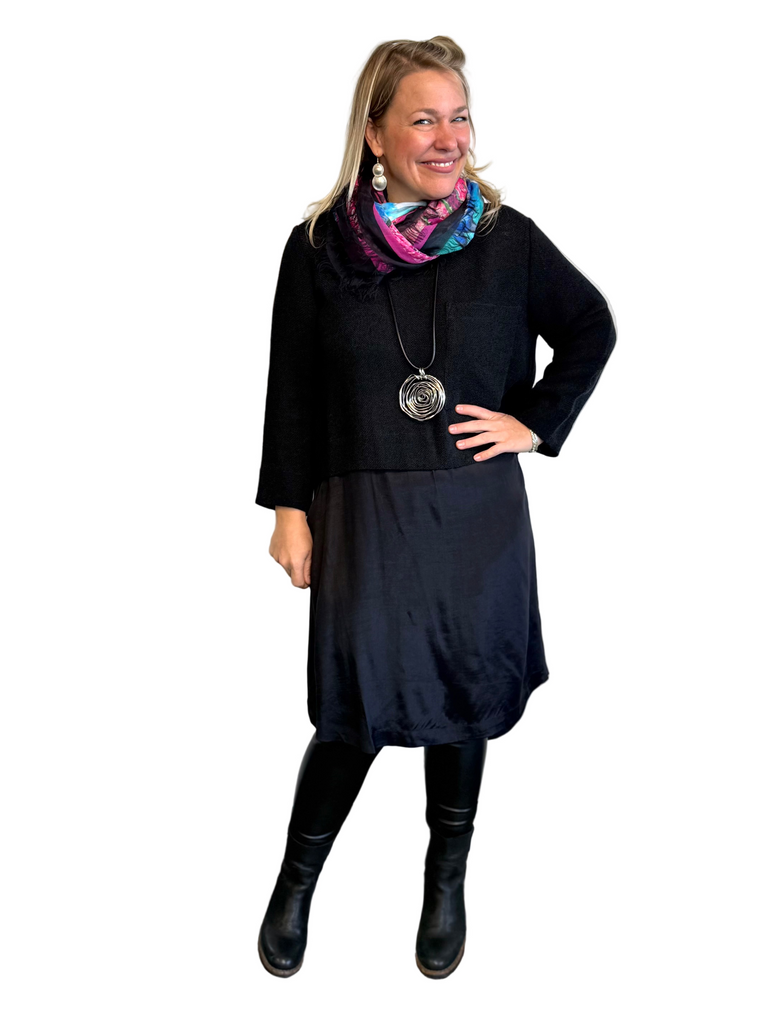 Create a stylish look with this dress with built-in layering effect. The top of the dress is made from timeless and elegant bouclé with a round neck, long sleeves and a decorative breast pocket, while the bottom is made from crisp cotton with an A-shape cut. Style the dress with a sparkling necklace or a patterned scarf.