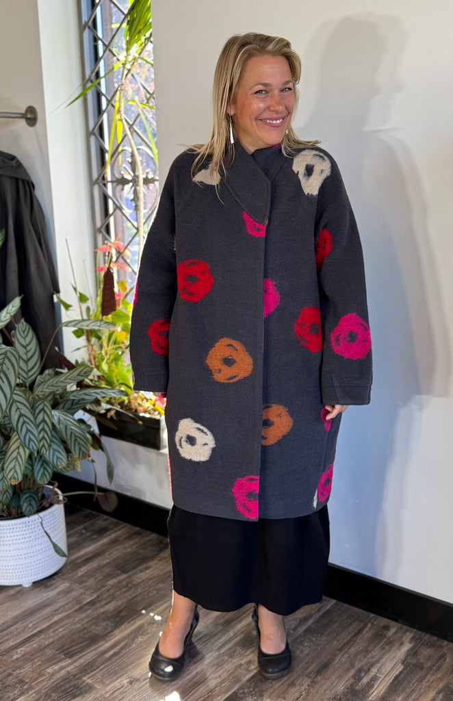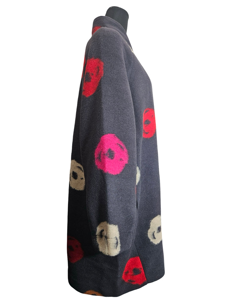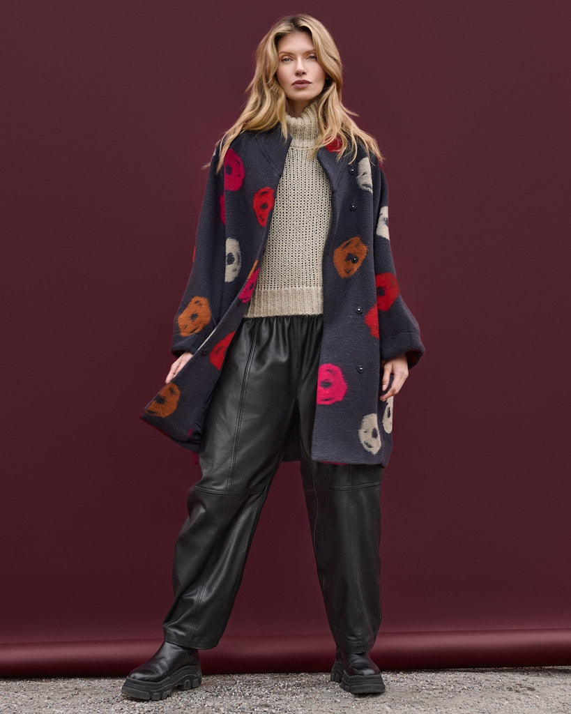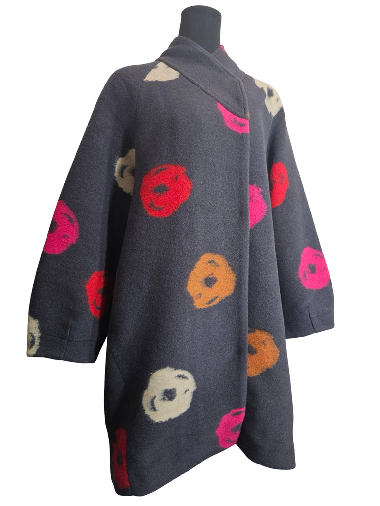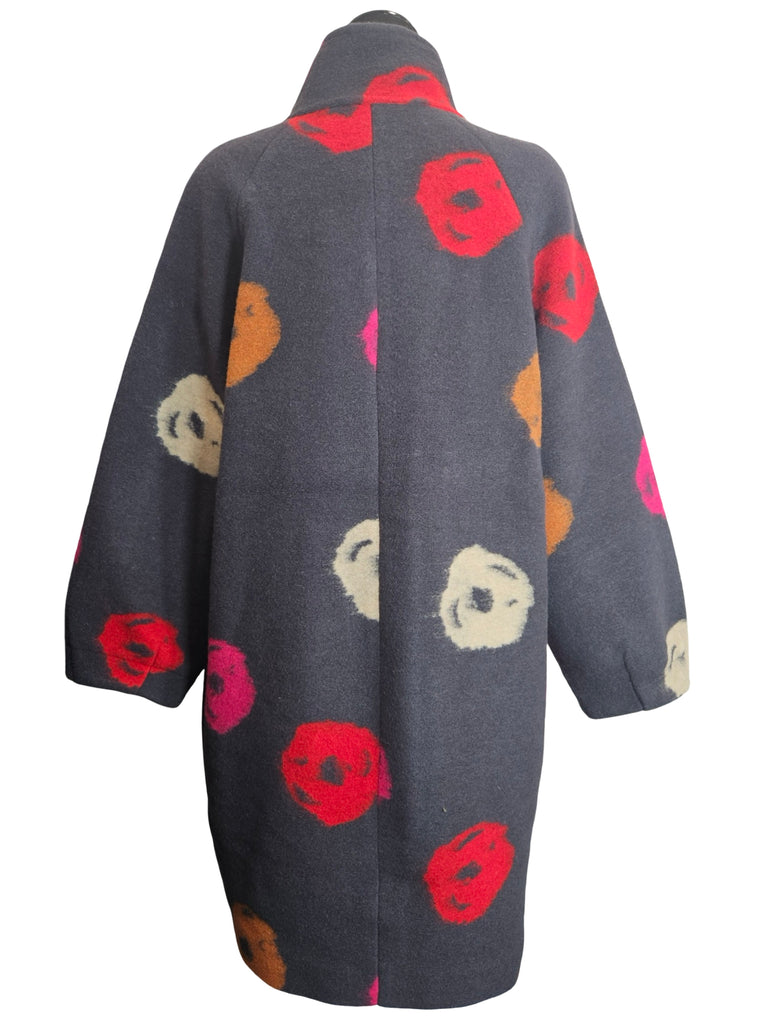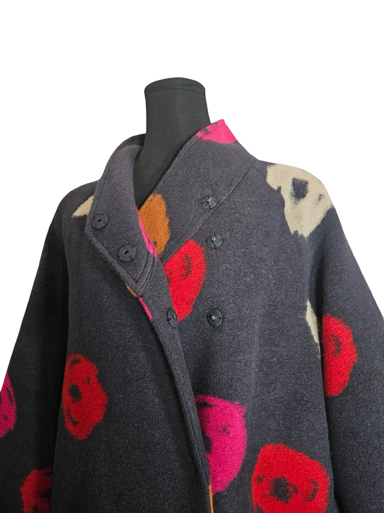 Thick and comfortable wool blend coat, featuring hidden snap closures, a back pleat detail, wrap collar, and a slight balloon silhouette.