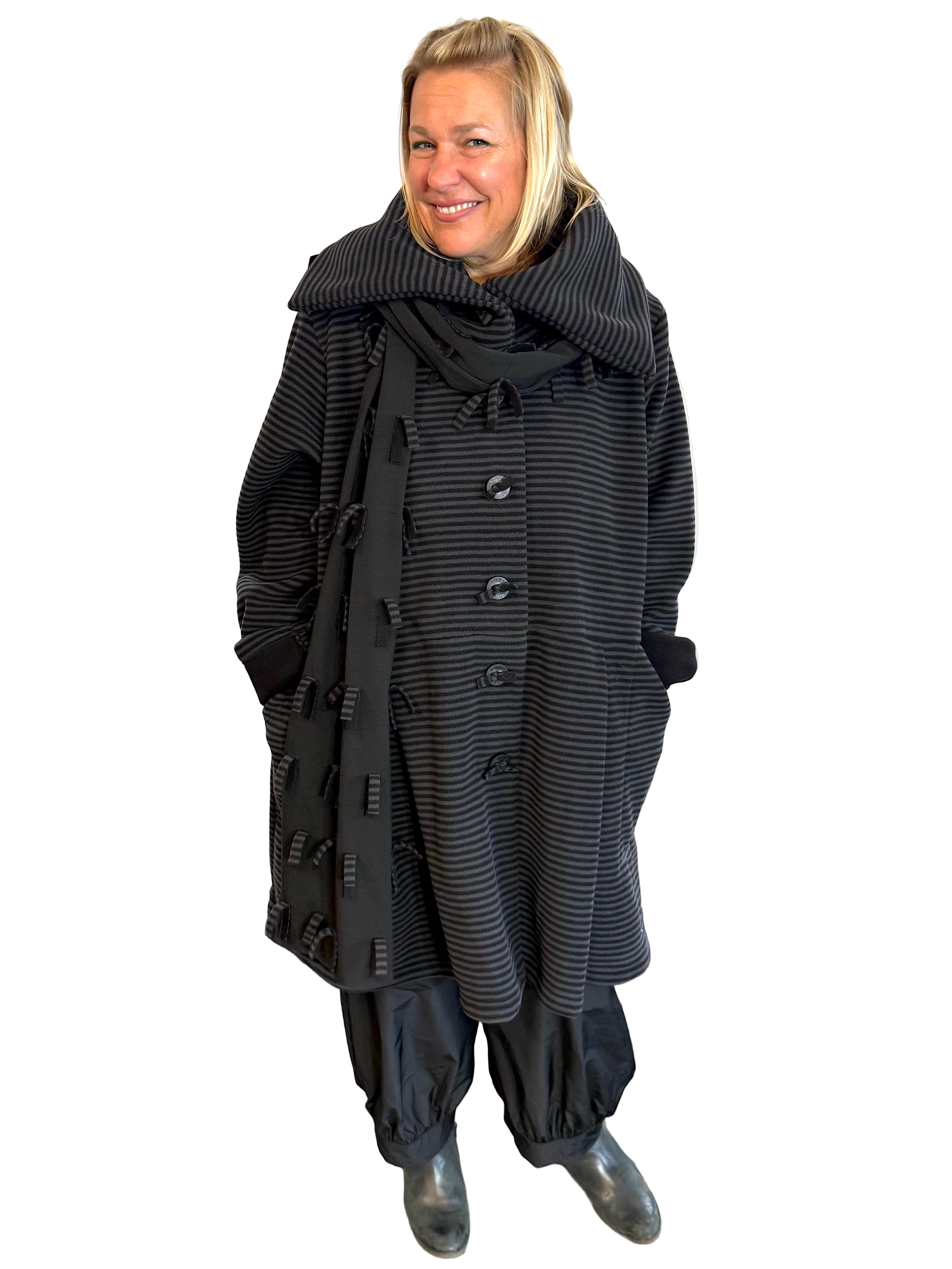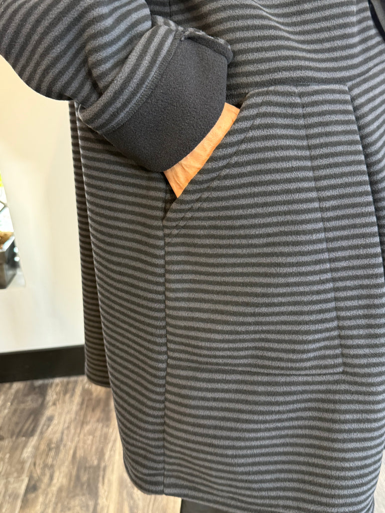 Loose-fitting jacket, made of fleece. The jacket falls above the knee and has box pleats at the front and back, which provides extra space and freedom of movement.