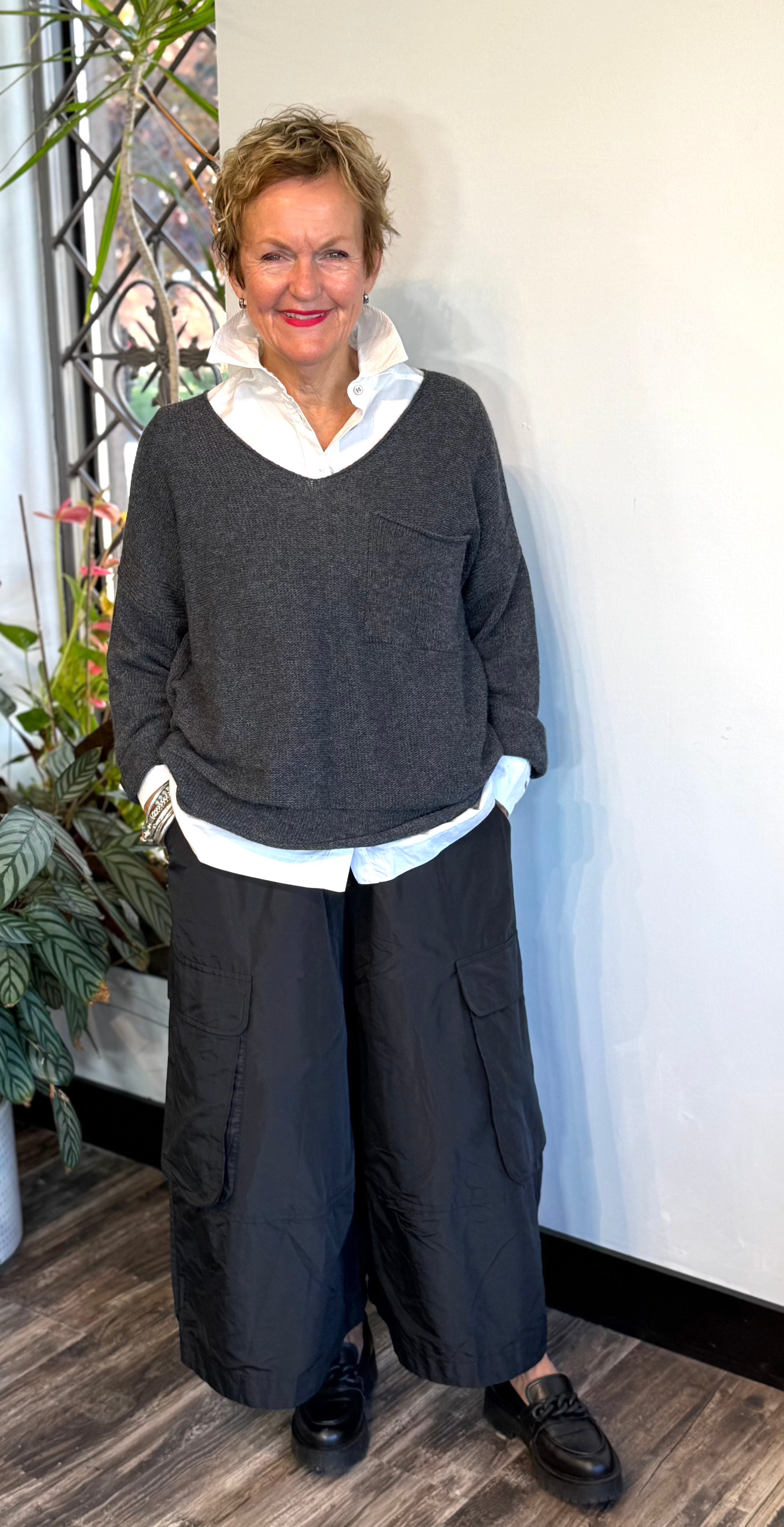 A refined layering piece with an effortless attitude, this sweater is shaped with a relaxed drape and a luxe cashmere-blend knit. The boxy cut, wide V-neck, and rolled finishes create a lived-in polish ideal for casual and elevated looks alike.