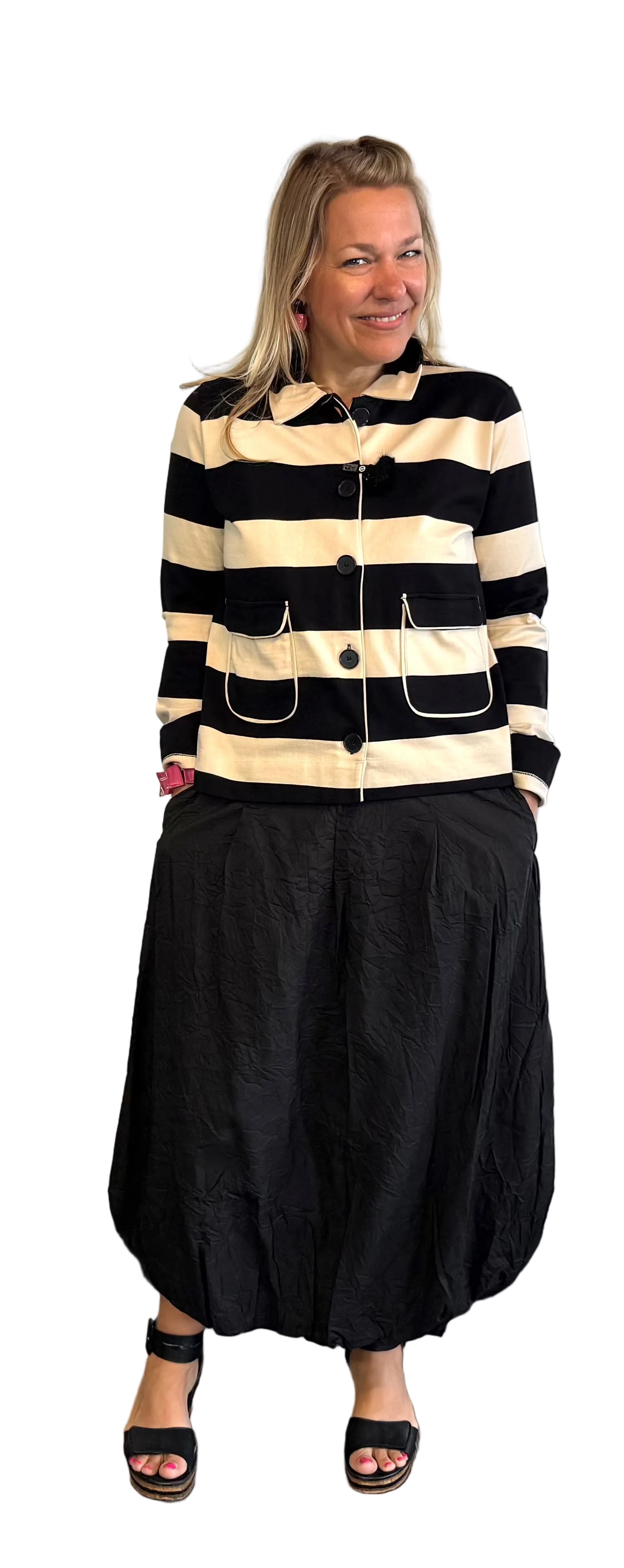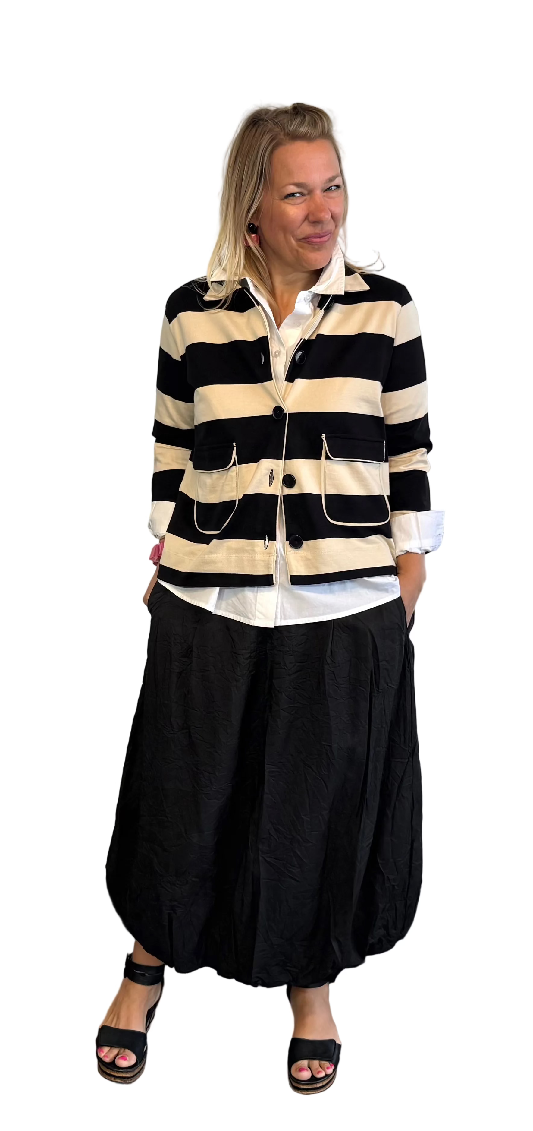 Make a statement with this striking striped jacket that blends timeless style with contemporary edge. The bold stripe pattern commands attention while the classic box cut ensures effortless layering over everything in your wardrobe. Crafted for those who refuse to blend in, the Jithara delivers versatile sophistication—dress it up for nights out or down for weekend ease. A wardrobe essential that proves stripes never go out of style.