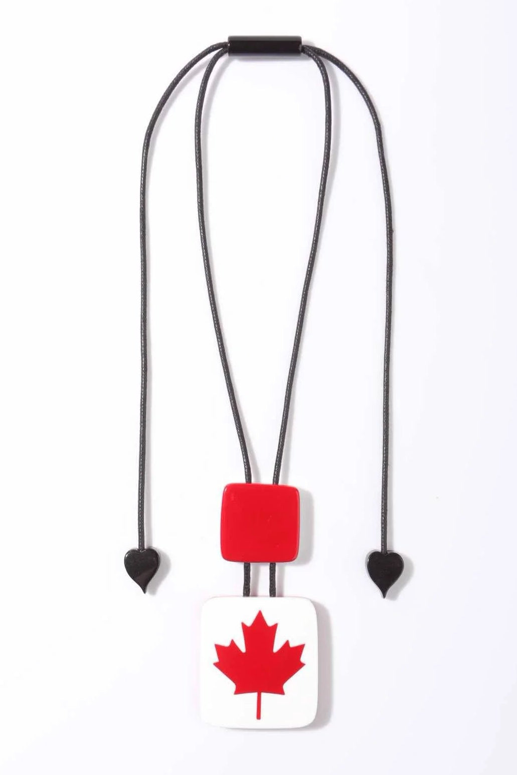 Features a maple leaf design on 6x7.5cm heart pendant. Adjustable length.