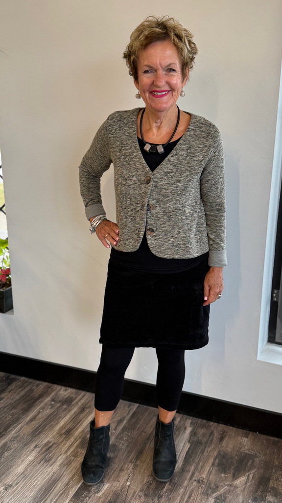 Fit Tip: Fitting snugger, Size up for comfort with leggings under. Lousje is in an XS (however she could go to Small no problem) Tessa is feeling good in the size Medium (Could go to small with a more fitted look)