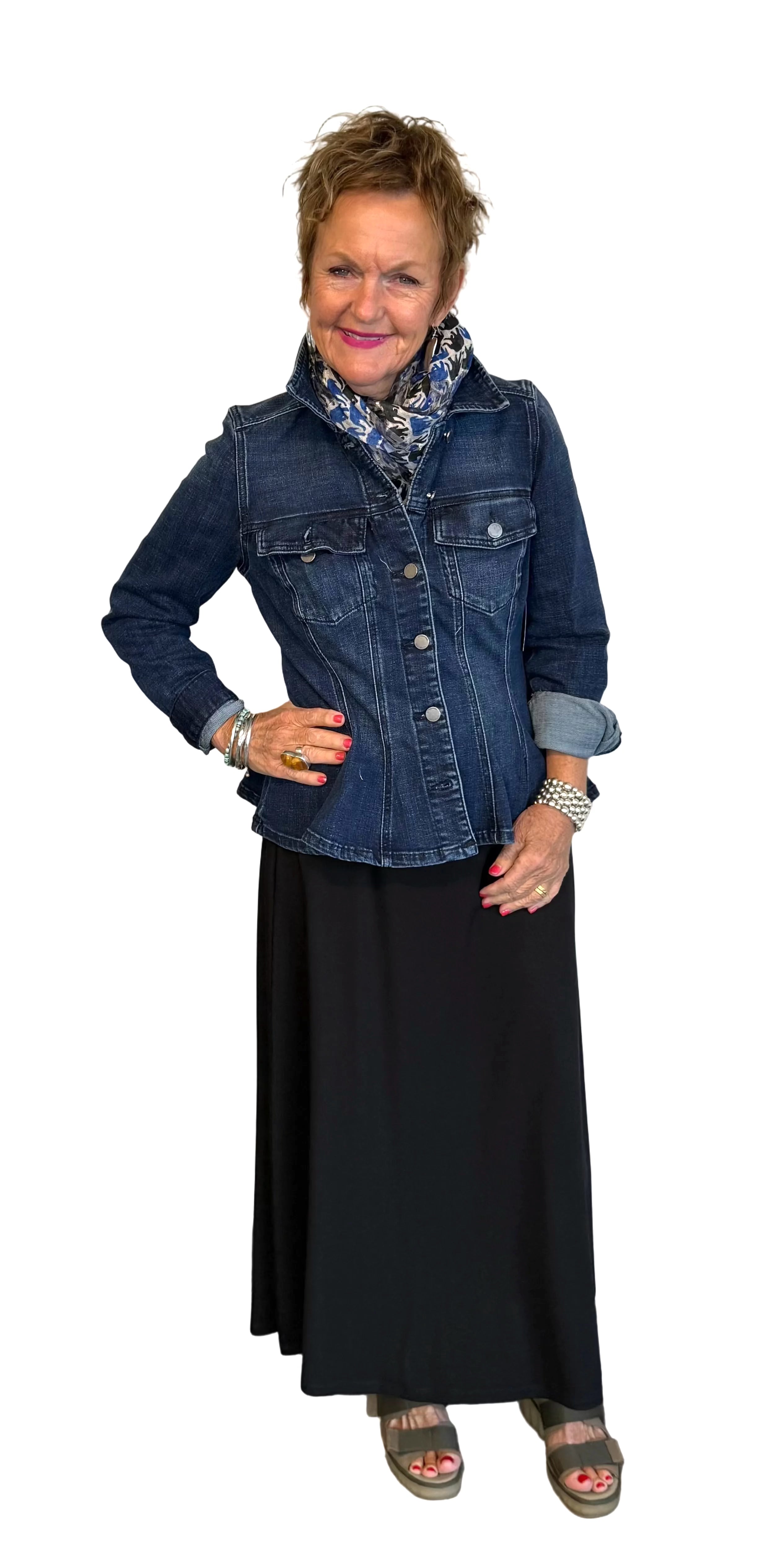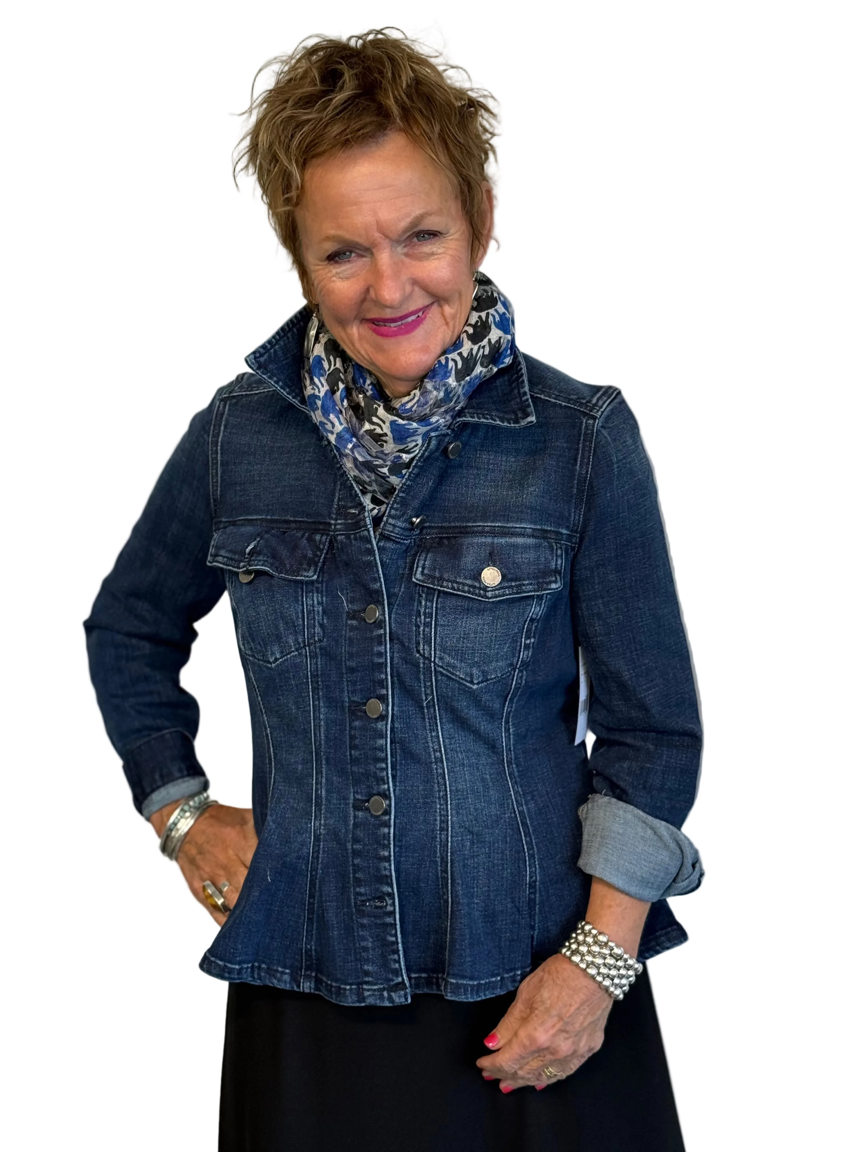 A fresh take on the classic trucker. This fit-and-flare jacket creates a defined shape with a soft sweep through the waist, blending structure with effortless movement. Finished with timeless flap pocket detailing for a look that feels both modern and iconic.